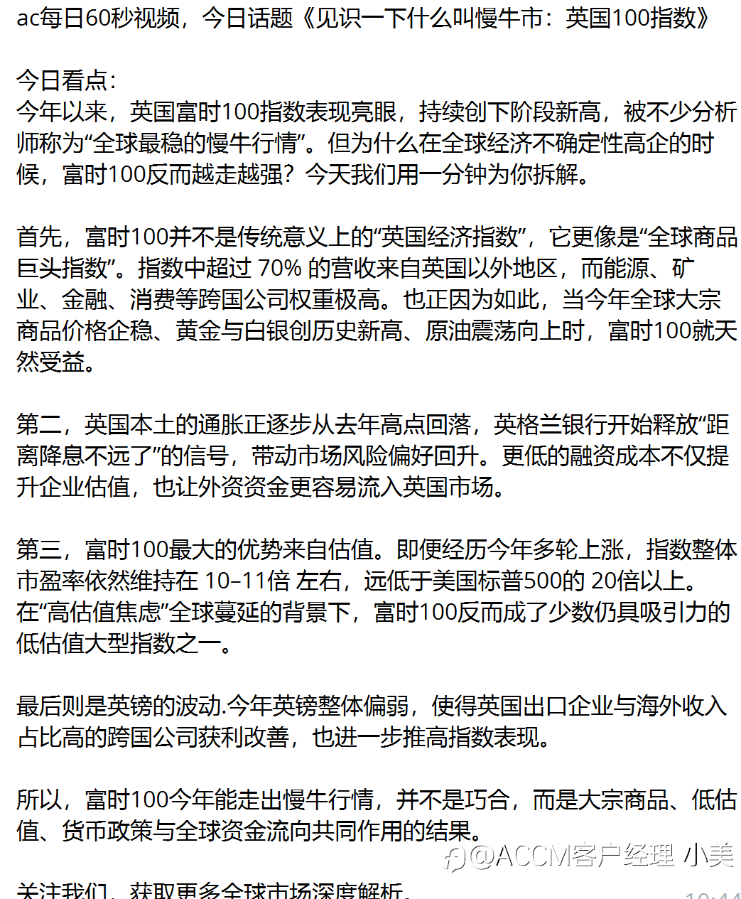 见识下什么叫慢牛市:英国100指数 PS:昨晚黄金的行情终于走舒畅啦😊 #ACCM##XAU/USD# 风险提示:本文所述仅代表作者个人观点,不代表 Followme 的官方立场。Followme 不对内容的准确性、完整性或可靠性作出任何保证,对于基于该内容所采取的任何行为,不承担任何责任,除非另有书面明确说明。