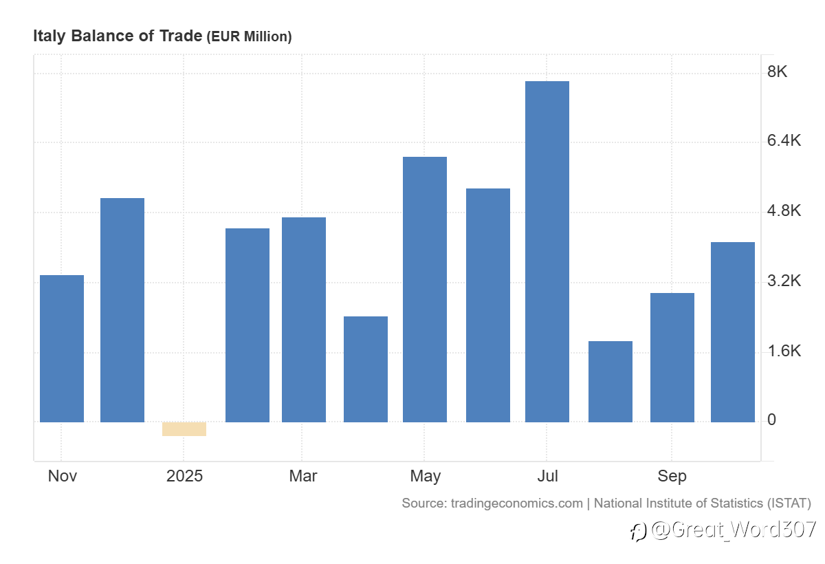 Italy’s trade surplus eased to €4.16B in October 2025, still beating market expectations.