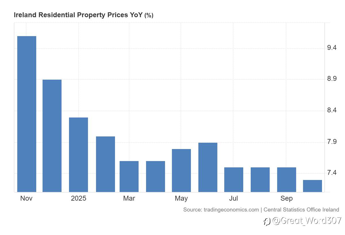 Ireland’s residential property prices rose 7.3% YoY in Oct 2025, the slowest pace since Feb 2024, signaling cooling momentum in the housing market.
