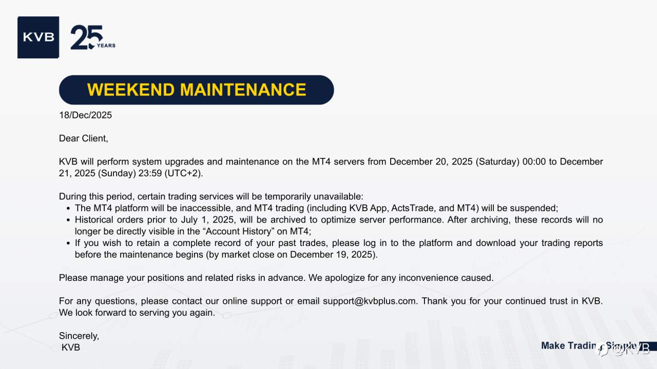 KVB will be upgrading MT4 servers from Dec 20 (Sat) 00:00 to Dec 21 (Sun) 23:59 (UTC+2).