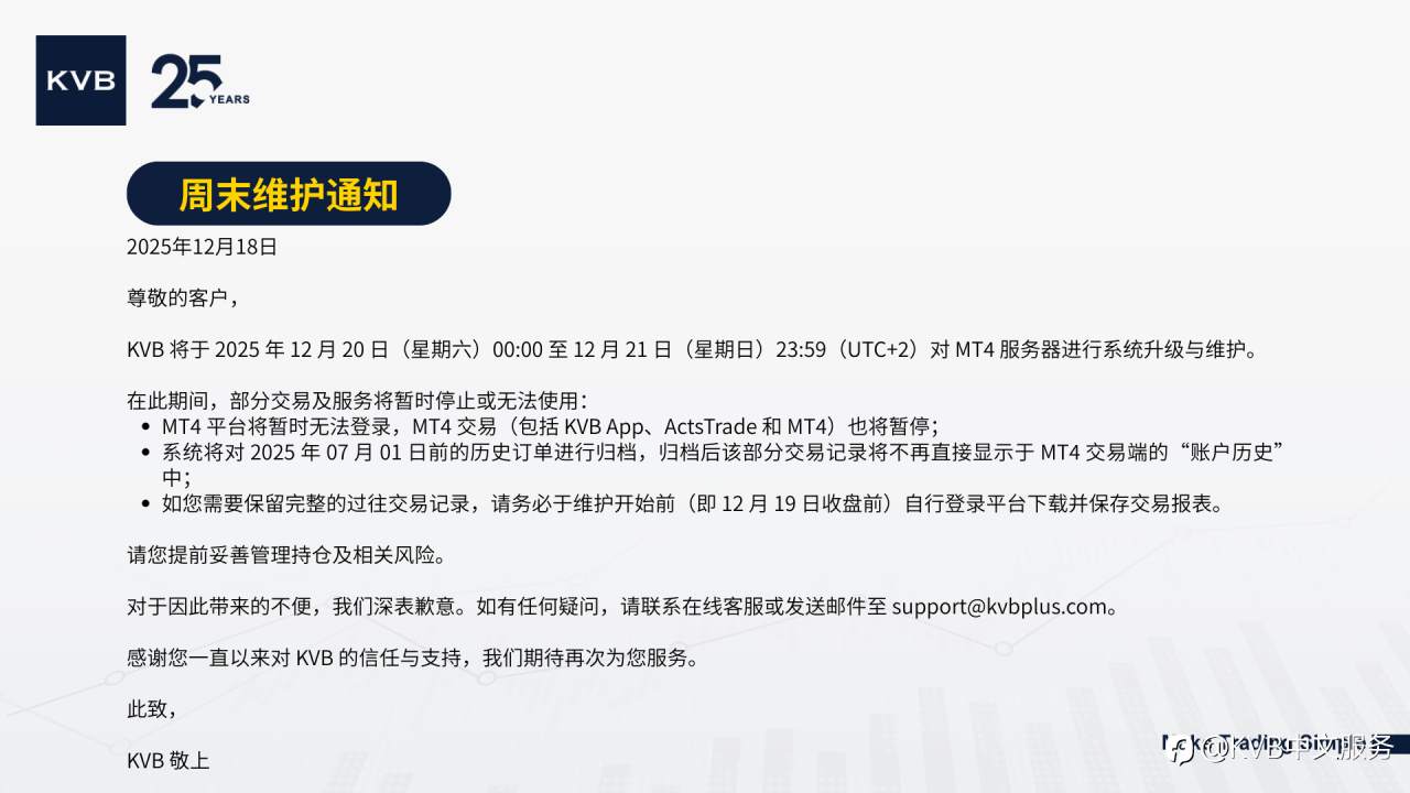 KVB 将于 12月20日(周六)00:00 至 12月21日(周日)23:59 UTC+2 进行 MT4 伺服器升级与维护。