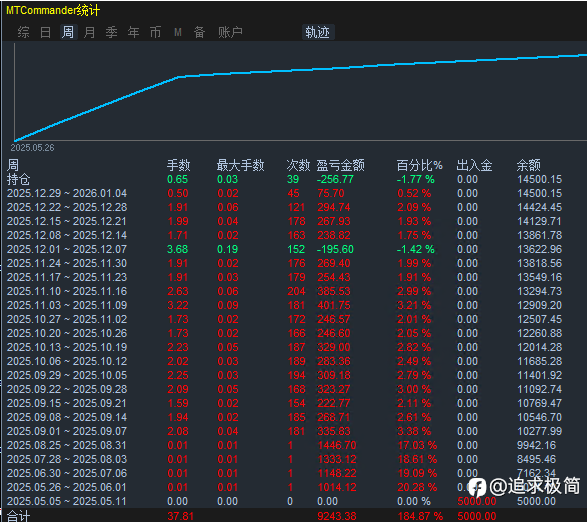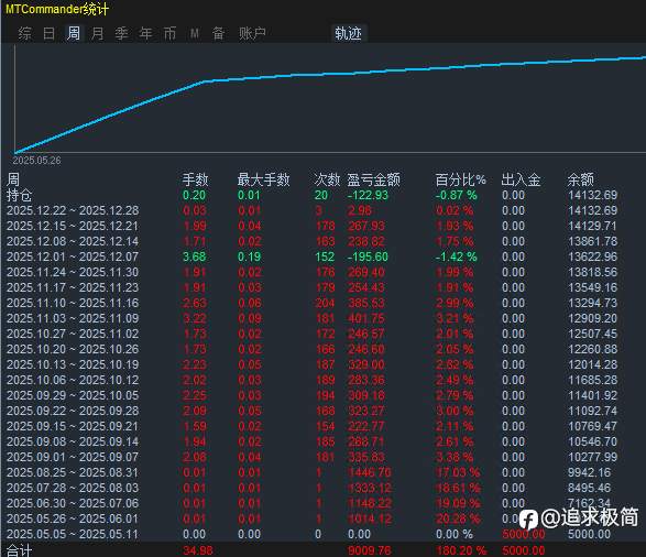 鱼鹰EA 3.0 上周盈利5.3%,不管行情如何,始终保持细水长流,运行7个多月总盈利180.2% 风险提示:本文所述仅代表作者个人观点,不代表 Followme 的官方立场。Followme 不对内容的准确性、完整性或可靠性作出任何保证,对于基于该内容所采取的任何行为,不承担任何责任,除非另有书面明确说明。
