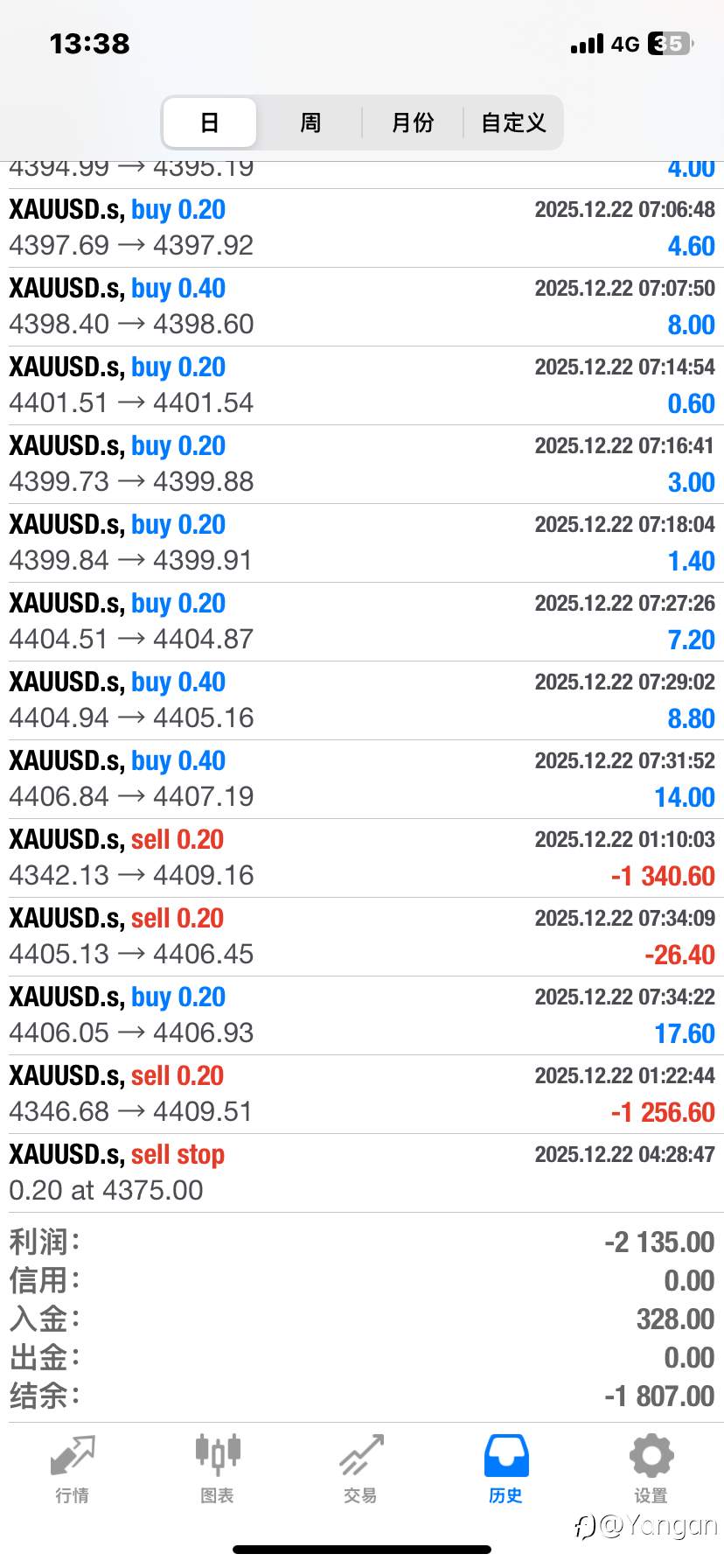 #每日交易打卡# 2025122。帐户年龄:8天,今天光荣爆仓。换思路觉得圣诞节了,全是假突破,那就按震荡思路做,然后自然就是老剧本,我就不信,我就不信,一路扛,扛出来了黄金历史新高。图形没有出来我是心高气傲,图形走出来的我是后悔酷酷乱造。🥲没啥好说,又入金1400,还剩700。一句话,路还很长,加油。打卡第6天