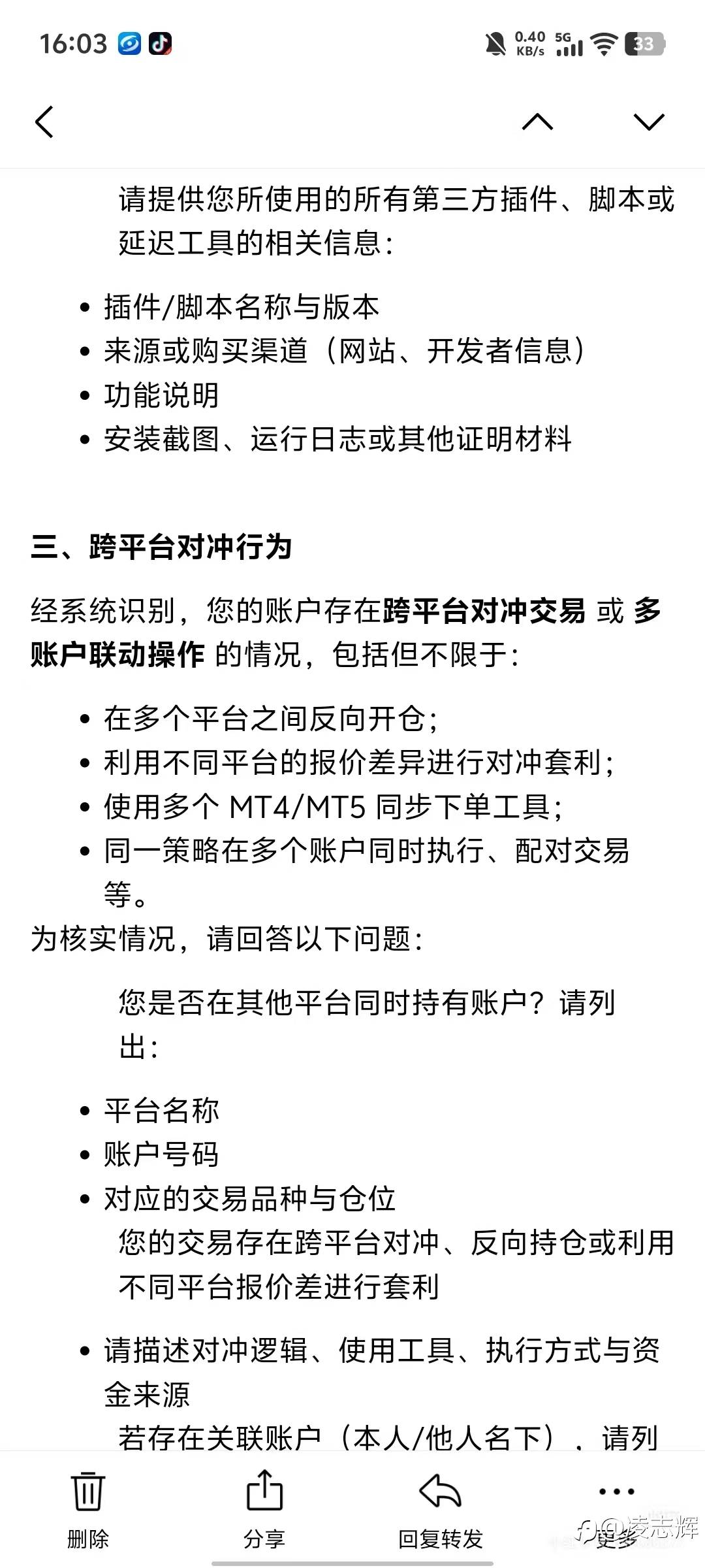 EC的违规交易的帽子是最多的,尤其是毒流量订单、对冲交易、剥头皮、持仓时间太短、频繁交易、复利交易、只交易一个品种....总之,盈利就是违规。 风险提示:本文所述仅代表作者个人观点,不代表 Followme 的官方立场。Followme 不对内容的准确性、完整性或可靠性作出任何保证,对于基于该内容所采取的任何行为,不承担任何责任,除非另有书面明确说明。