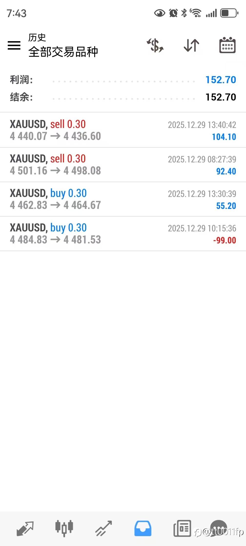 今日4单超短,三单盈利,一单亏损。。 风险提示:本文所述仅代表作者个人观点,不代表 Followme 的官方立场。Followme 不对内容的准确性、完整性或可靠性作出任何保证,对于基于该内容所采取的任何行为,不承担任何责任,除非另有书面明确说明。