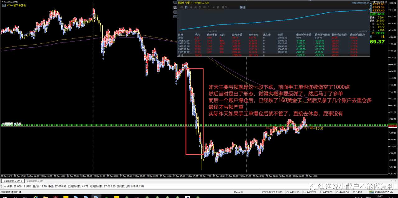 交易者有时候确实要认输,不认输,一年只要遇到昨天一次这种行情,就让你服!昨天手工账户本身爆了也就4w,然后自己又连续填了3个跑EA的账户去重仓多,真的是活该亏,不去填的话,从昨天爆仓到现在,EA账户的盈利也把爆仓亏损赚回来一半了。昨天EA最大浮亏都没过40%!! 风险提示:本文所述仅代表作者个人观点,不代表 Followme 的官方立场。Followme 不对内容的准确性、完整性或可靠性作出任何保证,对于基于该内容所采取的任何行为,不承担任何责任,除非另有书面明确说明。