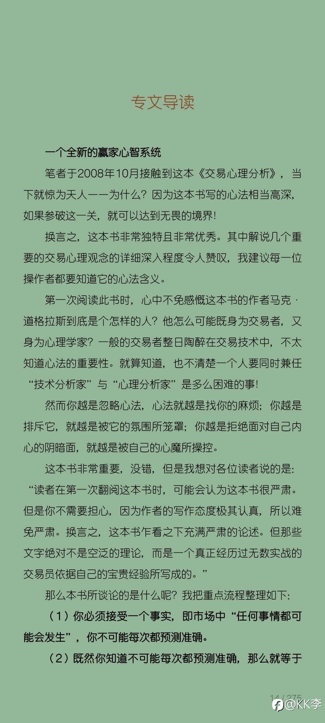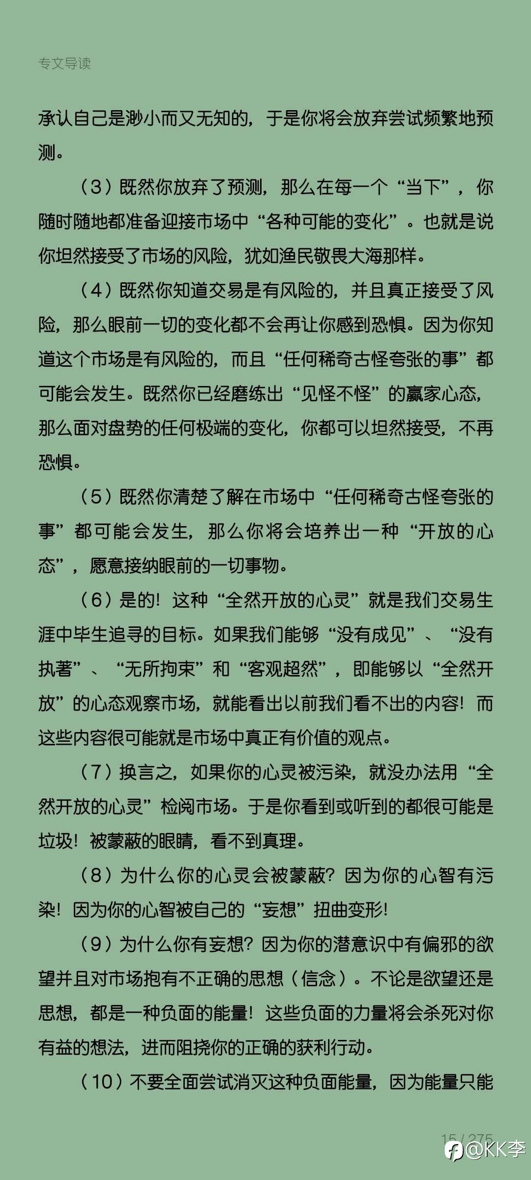 推荐《交易心理分析》 适合有交易系统,但执行力不足的朋友。 默念、冥想、训练三管齐下。 冥想+观想,大杀器。 风险提示:本文所述仅代表作者个人观点,不代表 Followme 的官方立场。Followme 不对内容的准确性、完整性或可靠性作出任何保证,对于基于该内容所采取的任何行为,不承担任何责任,除非另有书面明确说明。