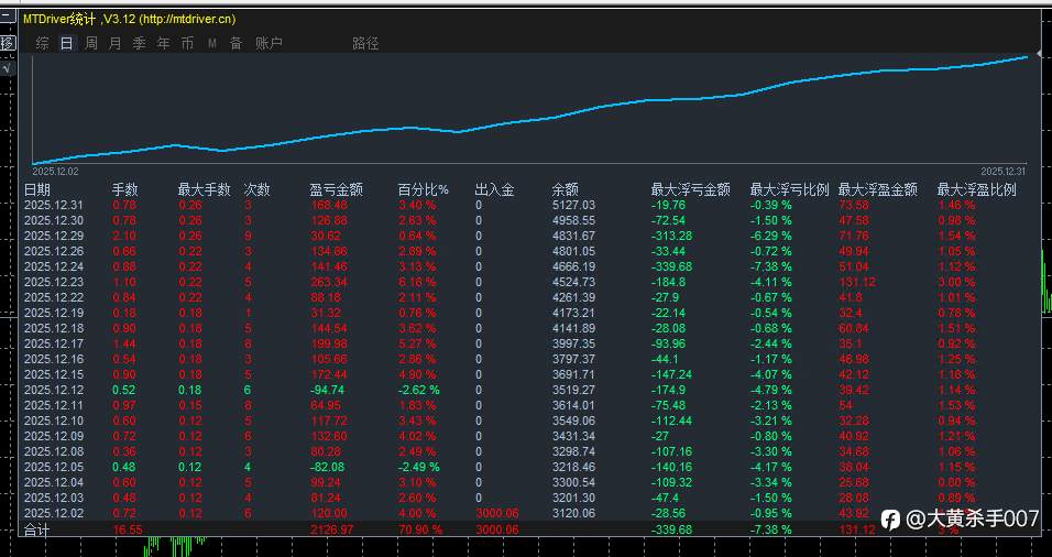 25年12月数据汇总报告!!以后每半月更新数据! 12月收益率70.9%,最大浮亏339,7.38%,胜率91%,总盈利2127刀 风险提示:本文所述仅代表作者个人观点,不代表 Followme 的官方立场。Followme 不对内容的准确性、完整性或可靠性作出任何保证,对于基于该内容所采取的任何行为,不承担任何责任,除非另有书面明确说明。