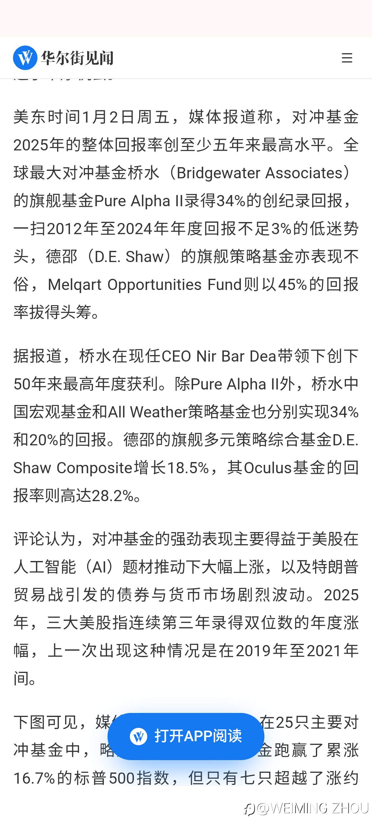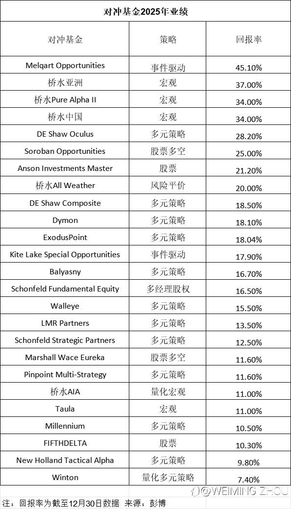 对冲基金2025龙虎榜:桥水旗舰基金回报34%创纪录! 这才是真正的投资!回报率30%行业内属于高水准! 风险提示:本文所述仅代表作者个人观点,不代表 Followme 的官方立场。Followme 不对内容的准确性、完整性或可靠性作出任何保证,对于基于该内容所采取的任何行为,不承担任何责任,除非另有书面明确说明。