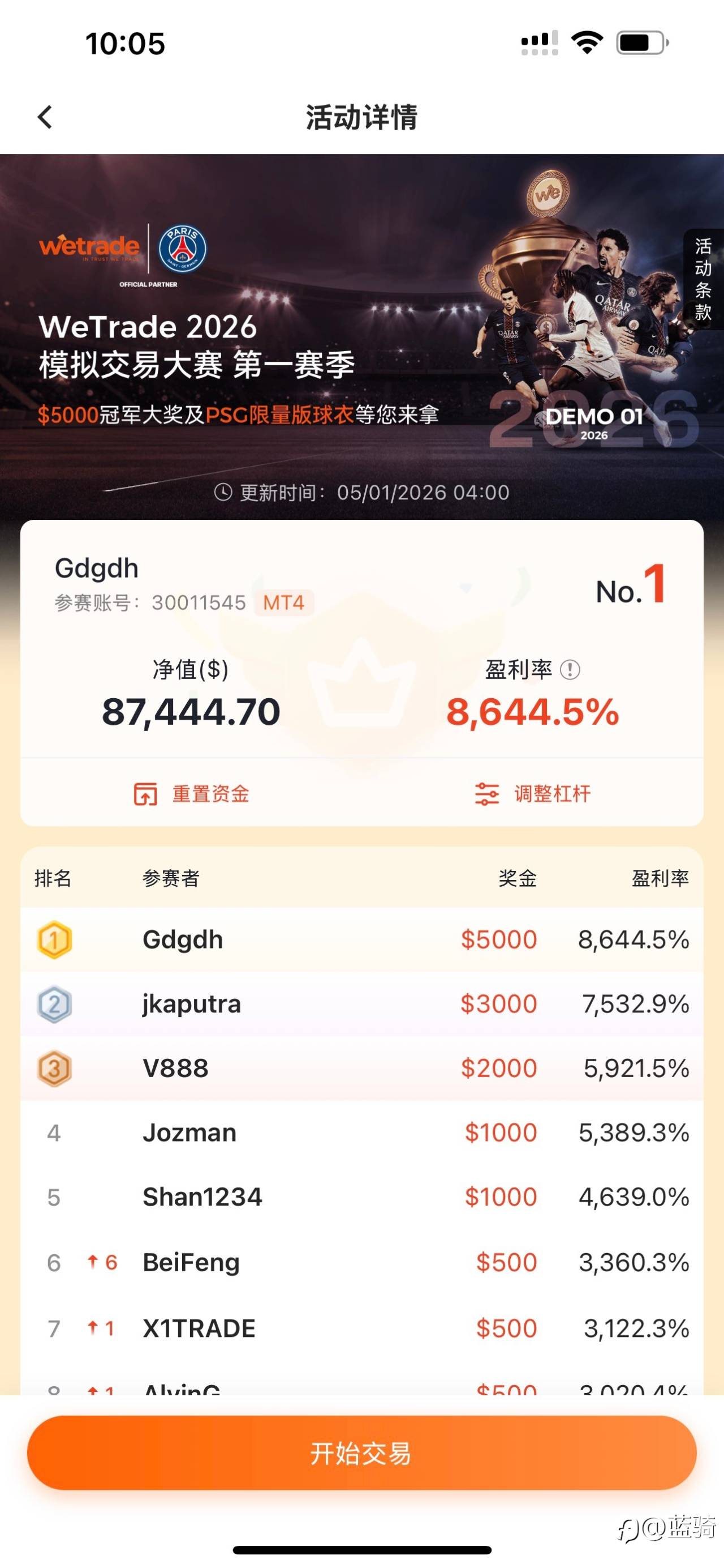 WeTrade 2026模拟交易大赛第一赛季火热进行中🔥 欢迎咨询 暂位第一 风险提示:本文所述仅代表作者个人观点,不代表 Followme 的官方立场。Followme 不对内容的准确性、完整性或可靠性作出任何保证,对于基于该内容所采取的任何行为,不承担任何责任,除非另有书面明确说明。