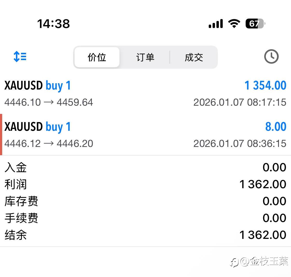 #XAU/USD# 【多单止盈离场,拿下13点】 第1单:依托早盘思路,4446北上,到达第一站4459止盈减仓,拿下1300刀,底仓回撤保本离场。 下一步 关注4小时支撑多的机会:回踩4425附近多,4418补,目标4440-4460#我的交易故事# #交易晒图# 风险提示:本文所述仅代表作者个人观点,不代表 Followme 的官方立场。Followme 不对内容的准确性、完整性或可靠性作出任何保证,对于基于该内容所采取的任何行为,不承担任何责任,除非另有书面明确说明。