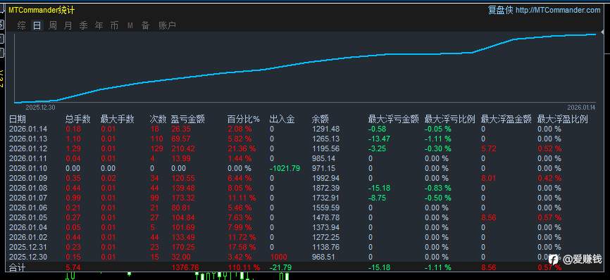 1000开始交易,每赚一倍出金,再从头开始交易1000,这速度大概是10天翻番一次! 风险提示:本文所述仅代表作者个人观点,不代表 Followme 的官方立场。Followme 不对内容的准确性、完整性或可靠性作出任何保证,对于基于该内容所采取的任何行为,不承担任何责任,除非另有书面明确说明。
