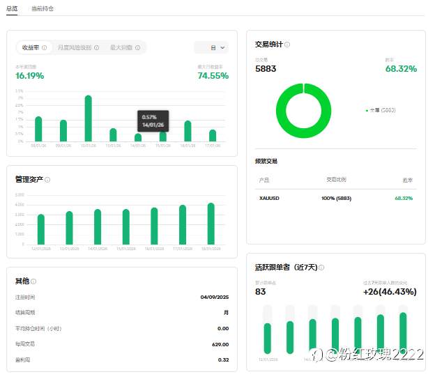 专注 XAUUSD 胜率 68%+ |交易持续进行中 稳步推进,不追行情。 跟单策略员:MaHsiu... 欢迎交流🤝 风险提示:本文所述仅代表作者个人观点,不代表 Followme 的官方立场。Followme 不对内容的准确性、完整性或可靠性作出任何保证,对于基于该内容所采取的任何行为,不承担任何责任,除非另有书面明确说明。