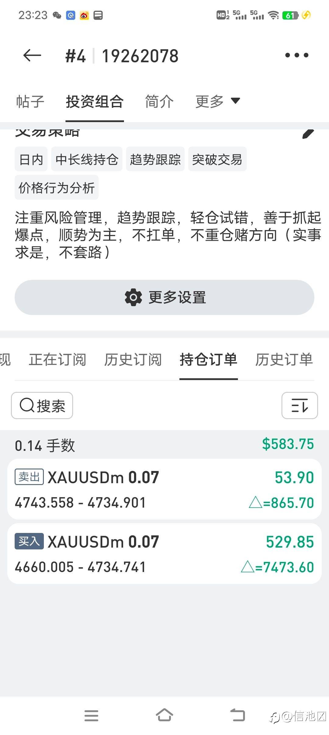 最近两个交易日,上周五到周一回撤了2000U,以后坚决不赌周末不确定性,人情绪出现异常切忌交易,上周五吃了大亏,频繁交易连续出错.昨晚挂单黄金4660,早上成交快速脱离成本吃一波90多点行情,还得走老路才行…… 风险提示:本文所述仅代表作者个人观点,不代表 Followme 的官方立场。Followme 不对内容的准确性、完整性或可靠性作出任何保证,对于基于该内容所采取的任何行为,不承担任何责任,除非另有书面明确说明。