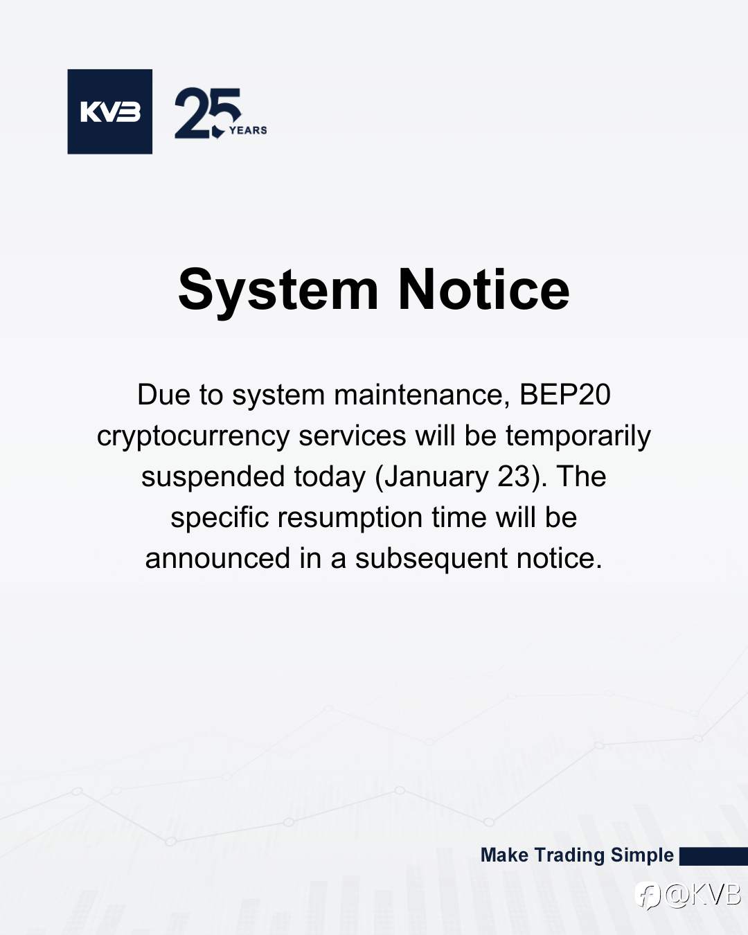 Due to system maintenance, BEP20 cryptocurrency services will be temporarily suspended today (January 23). The specific resumption time will be announced in a subsequent notice.