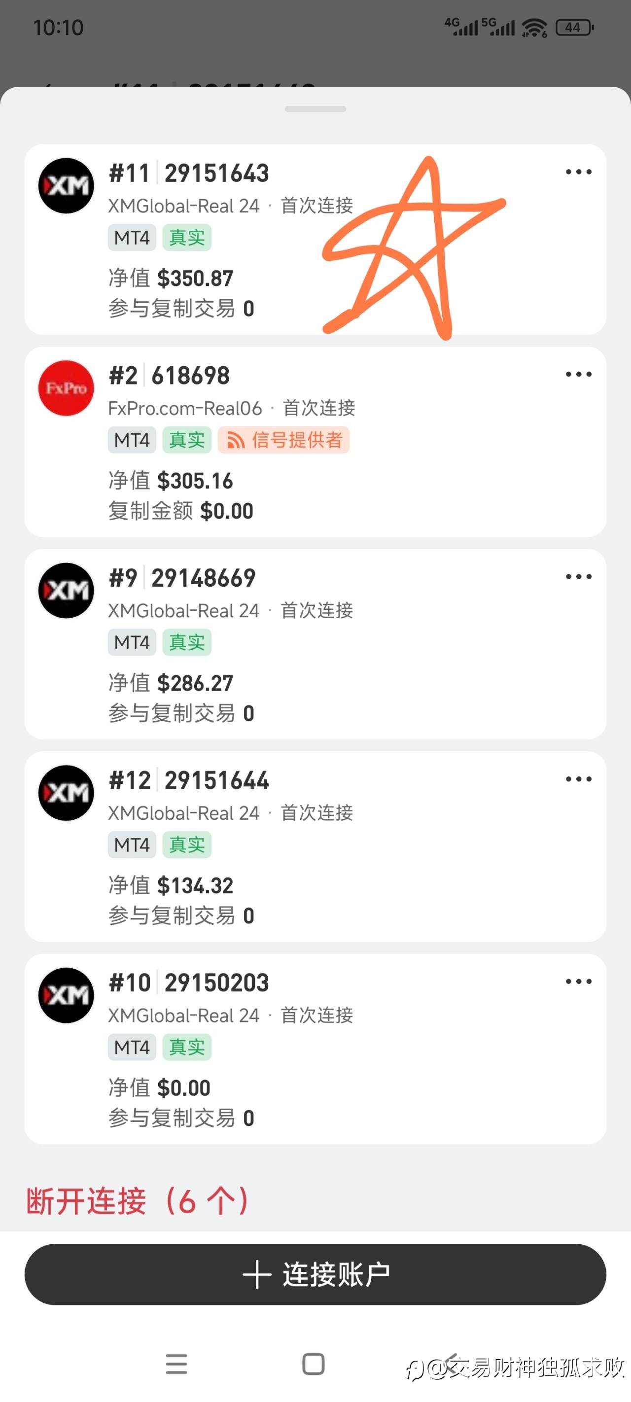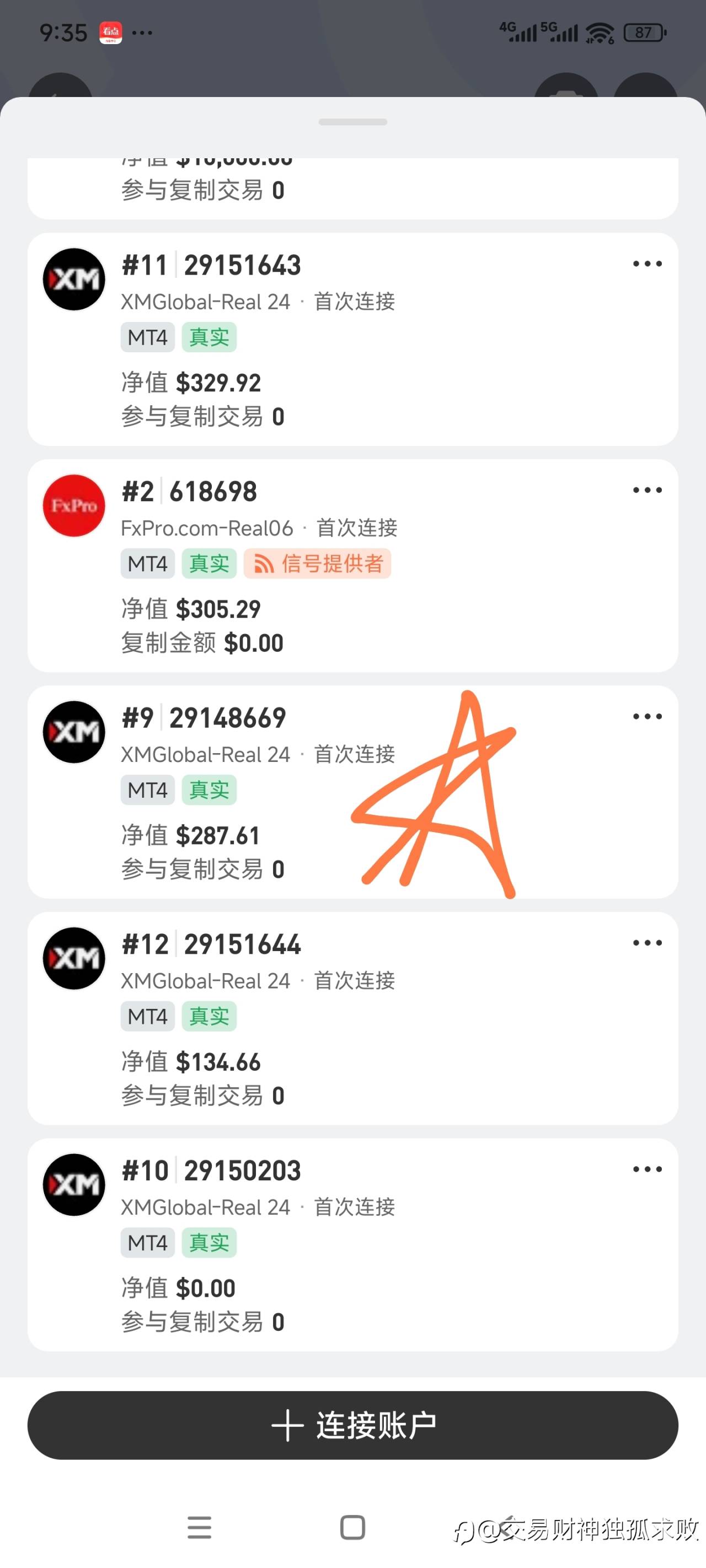 9号帐户,上次300刀跟随“老油条”,亏到221刀,由于波动起伏太大,我221刀停止跟随了,现在回到287了,马上快回本了。 风险提示:本文所述仅代表作者个人观点,不代表 Followme 的官方立场。Followme 不对内容的准确性、完整性或可靠性作出任何保证,对于基于该内容所采取的任何行为,不承担任何责任,除非另有书面明确说明。