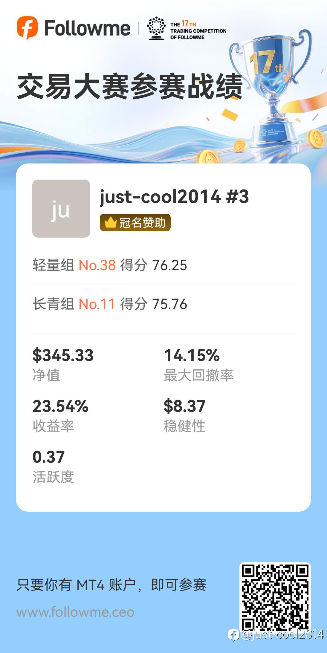 还行吧,只有这一个账户,没换过。下次争取进前20 风险提示:本文所述仅代表作者个人观点,不代表 Followme 的官方立场。Followme 不对内容的准确性、完整性或可靠性作出任何保证,对于基于该内容所采取的任何行为,不承担任何责任,除非另有书面明确说明。