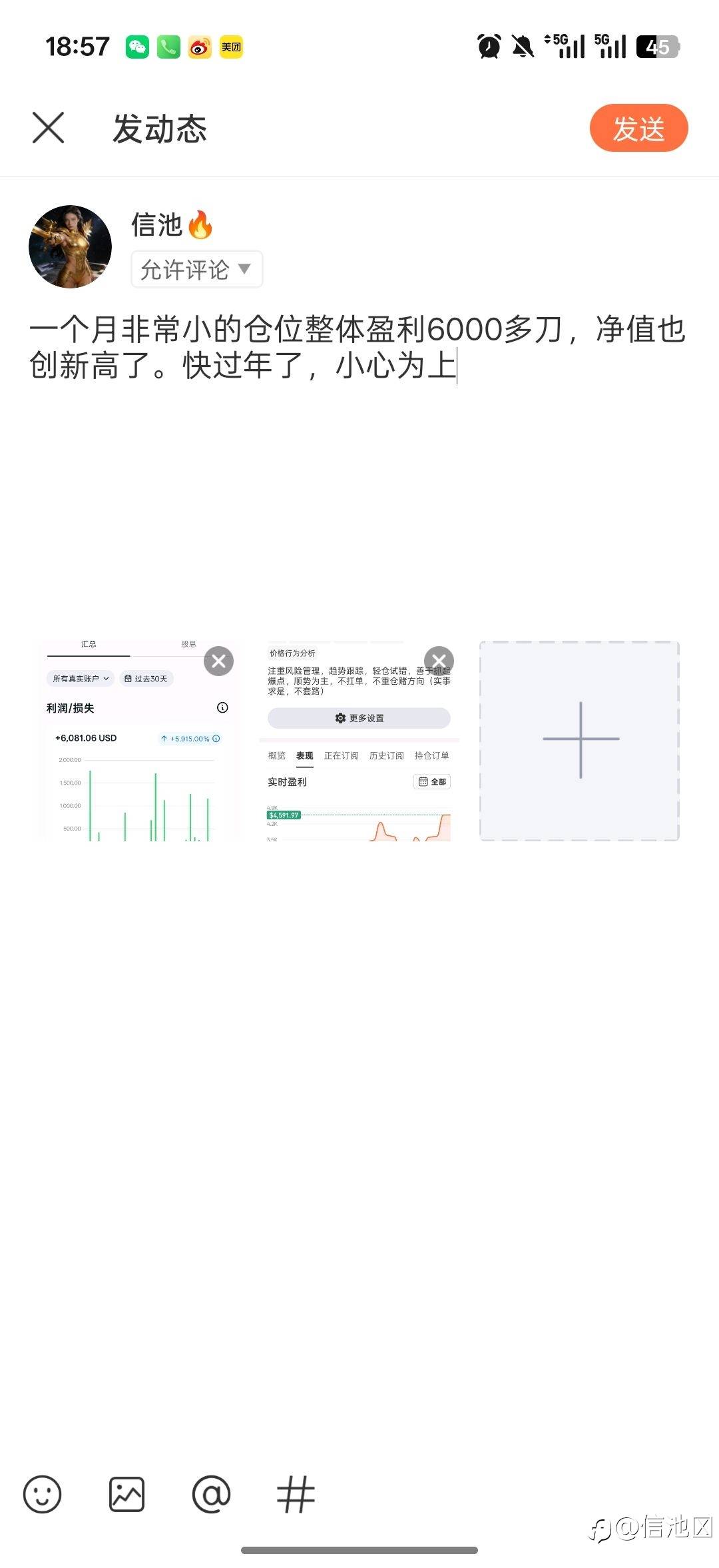不让发啊,一个月很小的仓位盈利6000多刀,快过年了小心为上 风险提示:本文所述仅代表作者个人观点,不代表 Followme 的官方立场。Followme 不对内容的准确性、完整性或可靠性作出任何保证,对于基于该内容所采取的任何行为,不承担任何责任,除非另有书面明确说明。