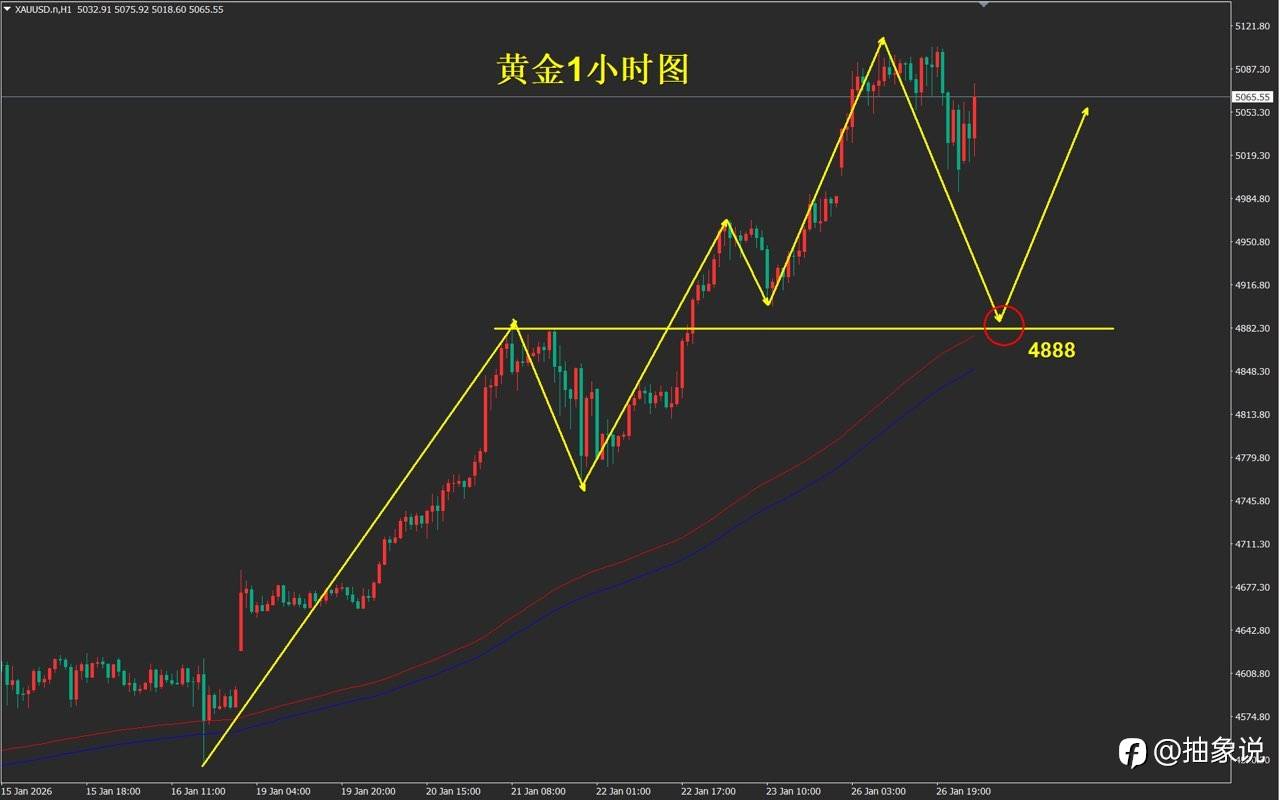 技术面上,短周期的技术点位都不大安全,极端的行情就要用极端的策略应对。今天我们直接耐心等待1小时维加斯通道的支撑位,点位在4888附近。这里也是前期高点水平支撑位,回调此处尝试布局多单。