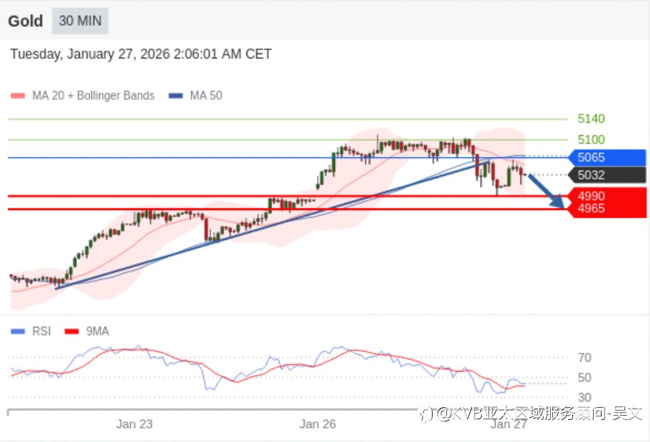 1月27日交易策略: 日内: 朝4990运行。 交易策略 在 5065 之下,看跌,目标价位为 4990 ,然后为 4965 。 备选策略 在 5065 上,看涨,目标价位定在 5100 ,然后为 5140。 技术点评 从技术角度上,RSI技术指标在50%中性区域下方。 风险提示:本文所述仅代表作者个人观点,不代表 Followme 的官方立场。Followme 不对内容的准确性、完整性或可靠性作出任何保证,对于基于该内容所采取的任何行为,不承担任何责任,除非另有书面明确说明。