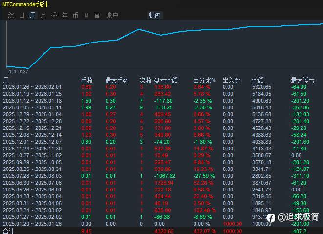 流星EA 已经稳定运行一年时间了!总盈利432.07% 风险提示:本文所述仅代表作者个人观点,不代表 Followme 的官方立场。Followme 不对内容的准确性、完整性或可靠性作出任何保证,对于基于该内容所采取的任何行为,不承担任何责任,除非另有书面明确说明。