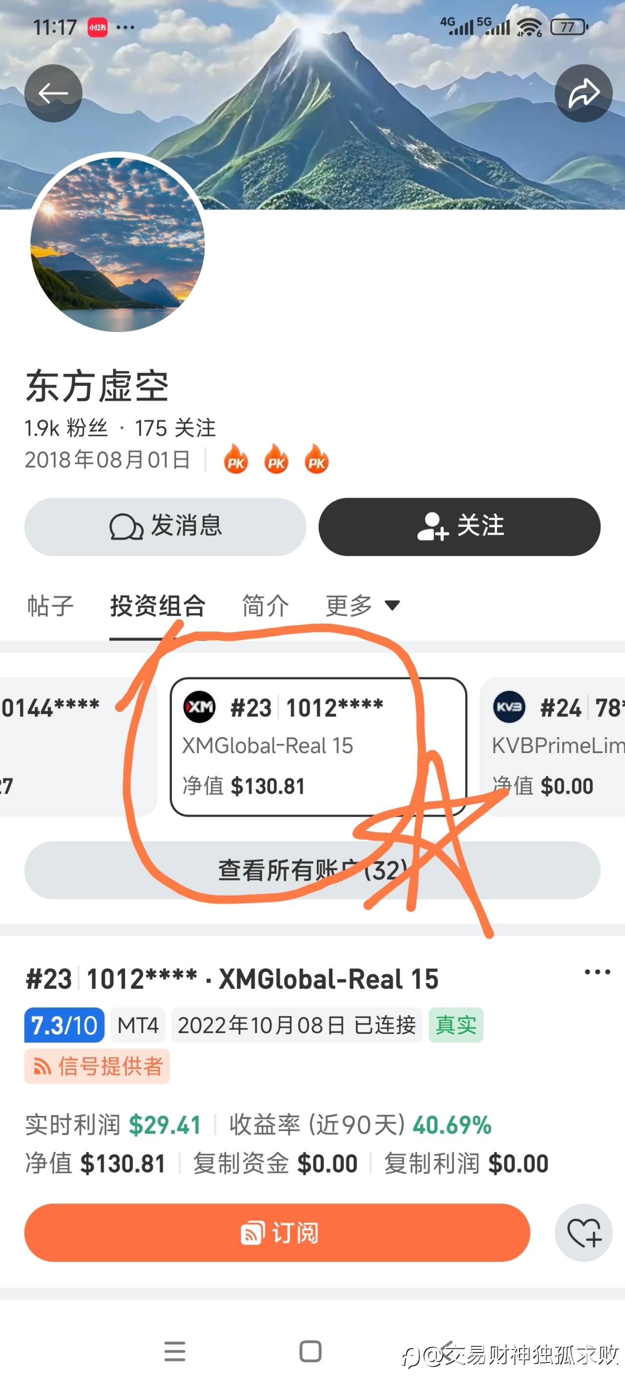 此人净值130刀,却期望订阅费100刀。这是不是希望天上掉馅饼!?自己又不是稳定盈利的交易员,人家花这么多钱订阅他,完全给他赚钱了! 风险提示:本文所述仅代表作者个人观点,不代表 Followme 的官方立场。Followme 不对内容的准确性、完整性或可靠性作出任何保证,对于基于该内容所采取的任何行为,不承担任何责任,除非另有书面明确说明。