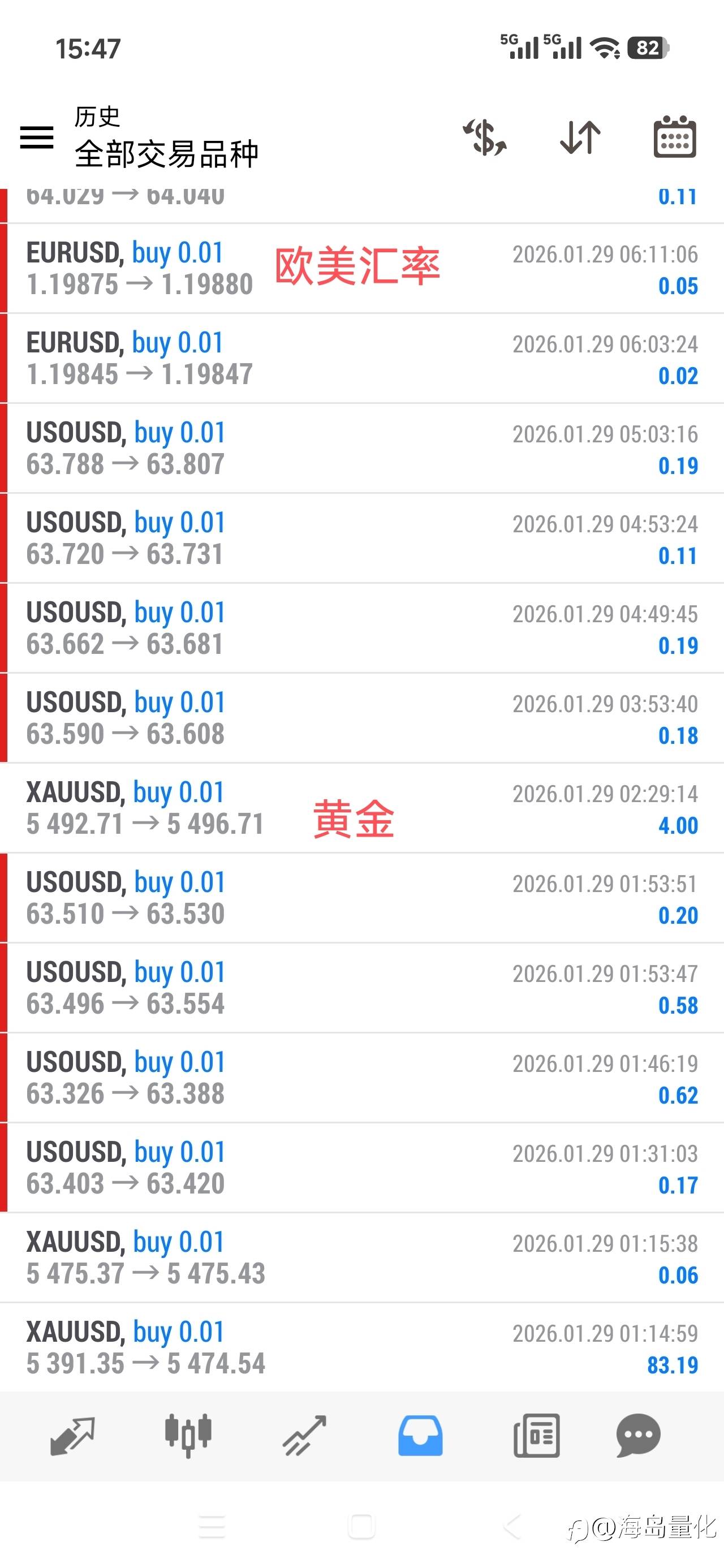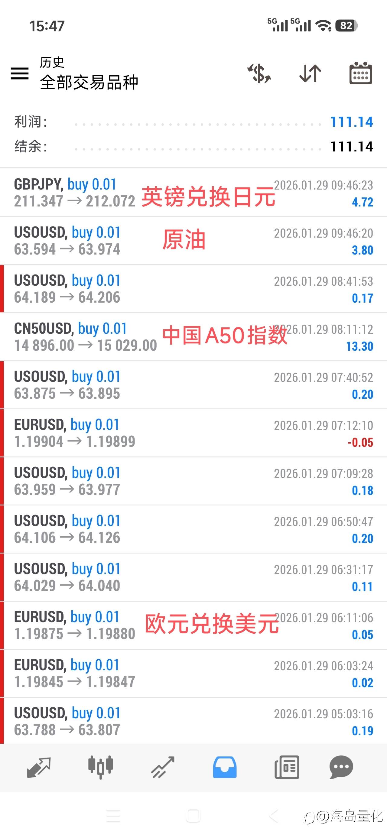 有人会问?以后黄金不涨了,你们海岛量化公司还能赚钱吗?我说当然能!我们的优秀能力就是:已将许多品种都开发成了自动交易。而且每隔一段时间会挑出最优秀的品种。 风险提示:本文所述仅代表作者个人观点,不代表 Followme 的官方立场。Followme 不对内容的准确性、完整性或可靠性作出任何保证,对于基于该内容所采取的任何行为,不承担任何责任,除非另有书面明确说明。
