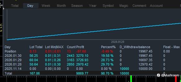 趋势马丁策略是一种结合趋势跟踪与马丁格尔加仓原理的交易方法。在判断市场出现明确趋势时,采用马丁格尔式的逆势加仓方式,利用趋势的持续性来降低传统马丁策略在震荡市中的爆仓风险.有兴趣可以关注我的#2账号 风险提示:本文所述仅代表作者个人观点,不代表 Followme 的官方立场。Followme 不对内容的准确性、完整性或可靠性作出任何保证,对于基于该内容所采取的任何行为,不承担任何责任,除非另有书面明确说明。