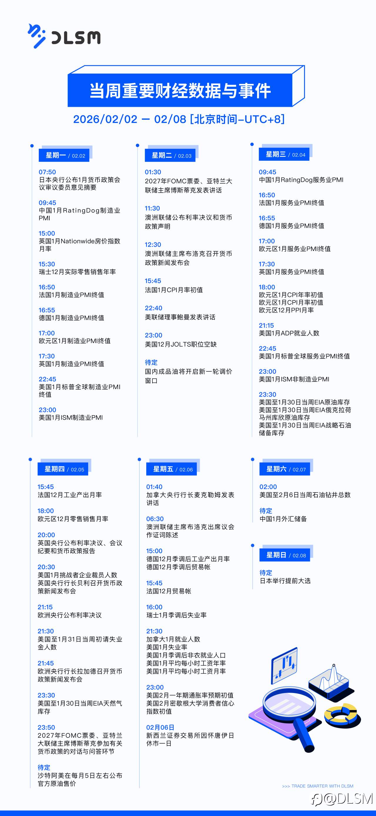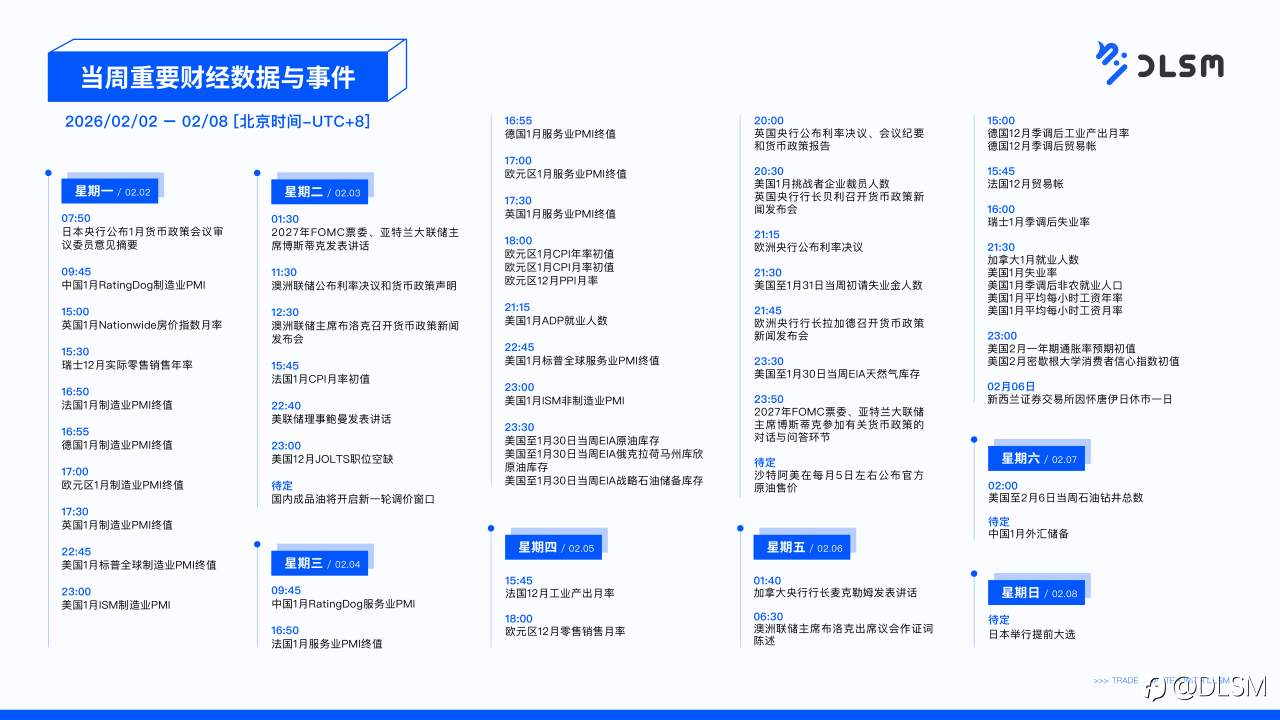 当周重要财经数据与事件(02/02-02/08) 已编辑 02 Feb 2026, 15:50 风险提示:本文所述仅代表作者个人观点,不代表 Followme 的官方立场。Followme 不对内容的准确性、完整性或可靠性作出任何保证,对于基于该内容所采取的任何行为,不承担任何责任,除非另有书面明确说明。