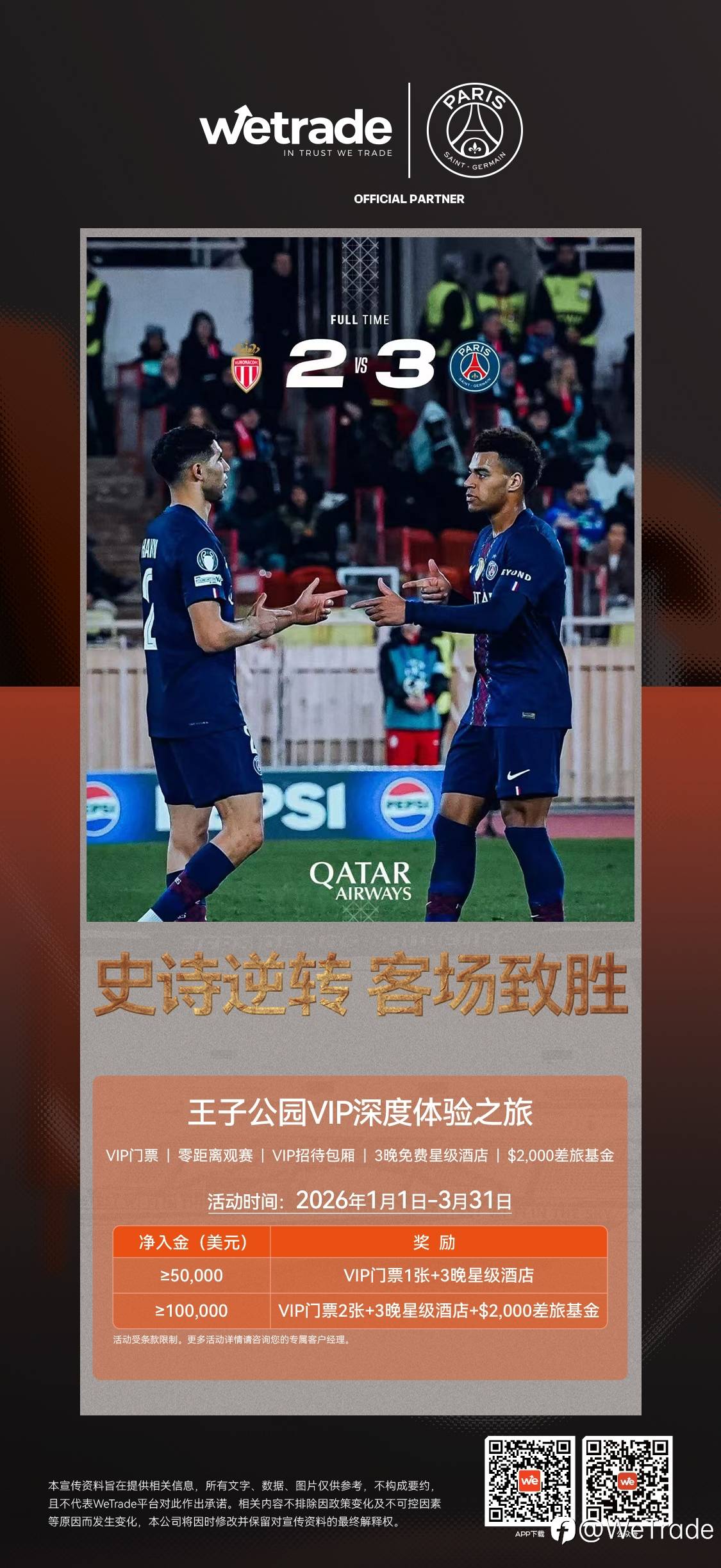 欧冠客场逆转!PSG战胜摩纳哥⚽️ 逆风翻盘的瞬间,每一秒都让人热血沸腾! WeTrade邀您一同见证荣耀时刻 现在参与「王子公园VIP深度体验之旅」,净入金达标即享VIP门票、星级酒店、2000美元差旅基金,亲临王子公园,近距离感受豪门魅力! 风险提示:本文所述仅代表作者个人观点,不代表 Followme 的官方立场。Followme 不对内容的准确性、完整性或可靠性作出任何保证,对于基于该内容所采取的任何行为,不承担任何责任,除非另有书面明确说明。