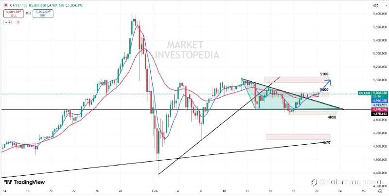 Price is holding above the key 5000 level (R1); sustained strength above this zone may push gold toward R2. The 12 EMA remains above the 52 EMA, supporting short-term bullish momentum.