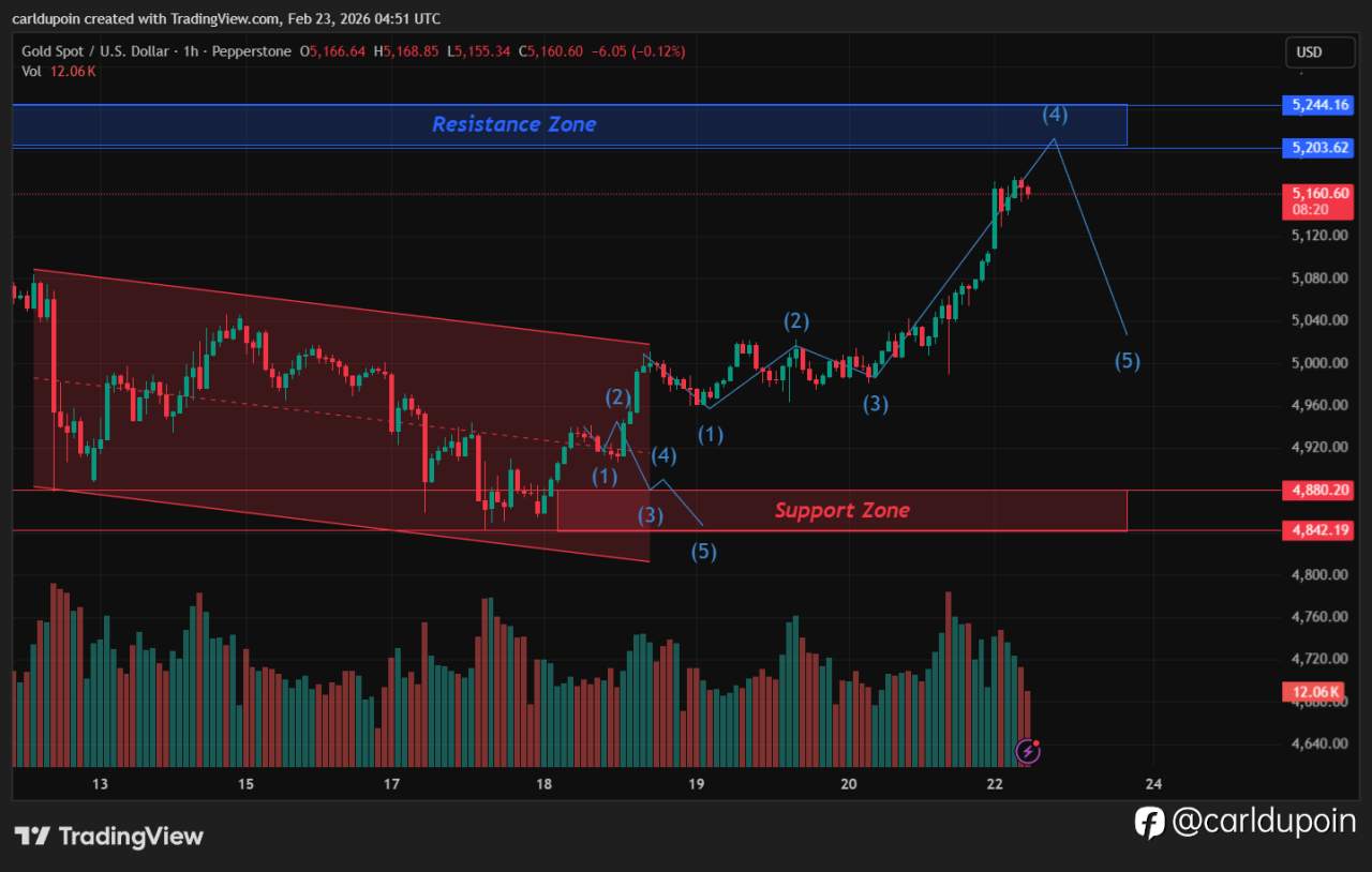 Gold (XAUUSD) is approaching a major resistance zone at 5,203–5,244 after completing a clean impulsive structure from the breakout.