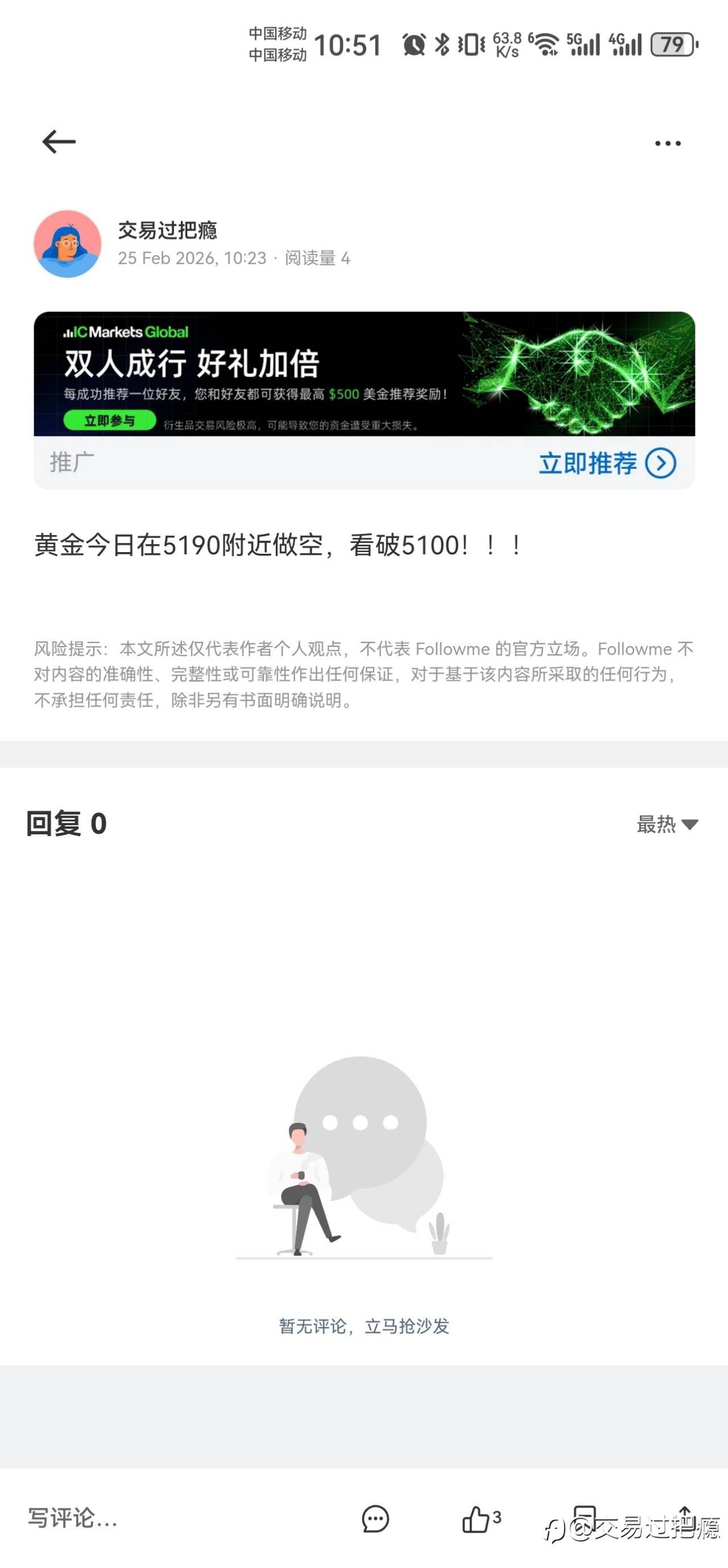 5190的空单已经获利10美金! 风险提示:本文所述仅代表作者个人观点,不代表 Followme 的官方立场。Followme 不对内容的准确性、完整性或可靠性作出任何保证,对于基于该内容所采取的任何行为,不承担任何责任,除非另有书面明确说明。