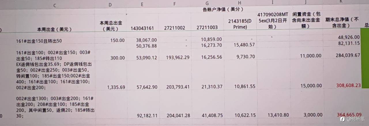 #每日交易打卡#收益比昨天手机算的要多些,看这周收益感觉这周有些激进,主要是exness前三账户收益额让人觉着上周持仓时肯定有风险暴露过大的时候。 下周就在总净值3600美金的基础上做。盈利在交易日先不转出了,等到周末再转出20%左右吧。下周50本账户0.04手起吧,尽量不手工单干涉;然后1900本账户降0.01到0.02仓位,留够本金以防50本账户需要救助;300本的就先暂时这样,或者降0.01手。两个净值100来美金的账户0.01手起,这两账户都已经翻倍了的,要不收益也暂时别取了,等到600后再取,这样这两账户就是很安全的了。
