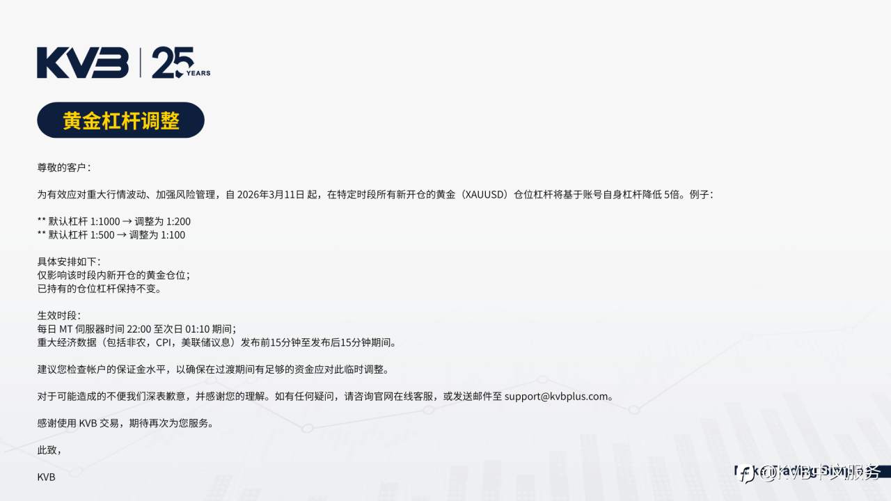 为有效应对重大行情波动并加强风险管理,KVB 将于 2026年3月11日 起,对 黄金(XAUUSD)新开仓位 在特定时段实施临时杠杆调整。