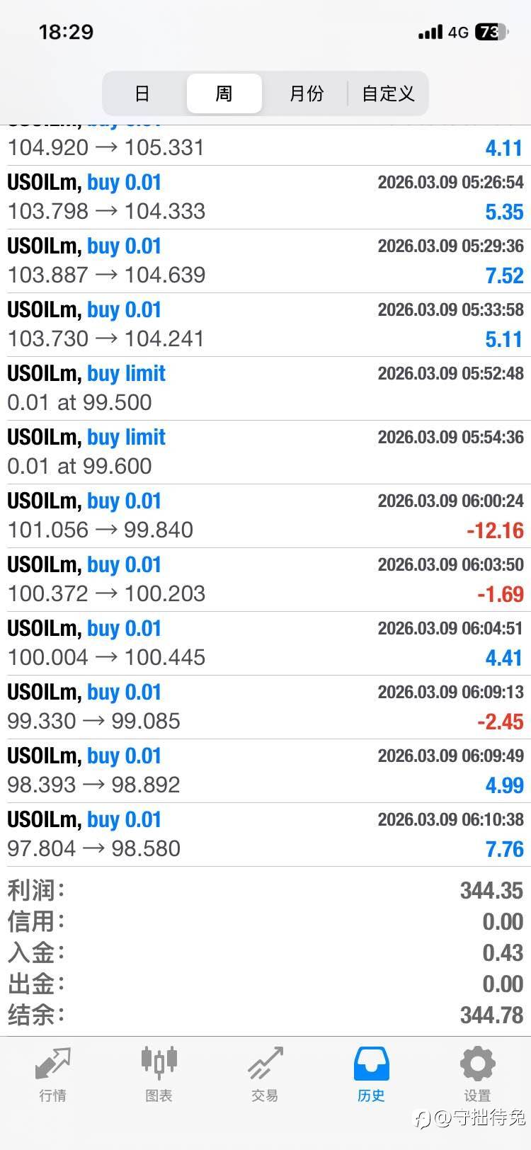 原油3天翻一倍了,战争行情追单进场 已编辑 09 Mar 2026, 18:29 风险提示:本文所述仅代表作者个人观点,不代表 Followme 的官方立场。Followme 不对内容的准确性、完整性或可靠性作出任何保证,对于基于该内容所采取的任何行为,不承担任何责任,除非另有书面明确说明。
