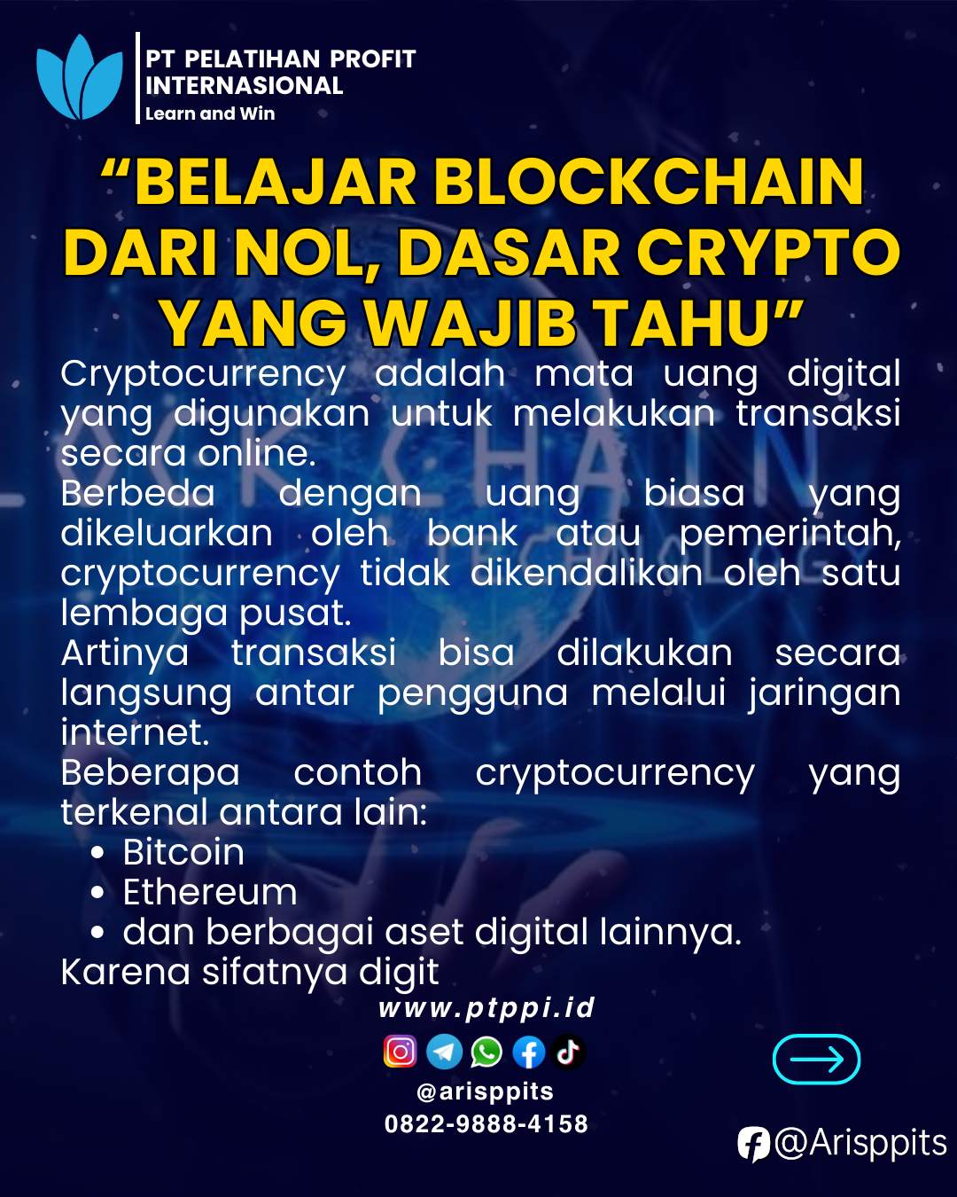 Cryptocurrency adalah aset digital yang menggunakan teknologi blockchain untuk mencatat transaksi secara aman dan transparan.