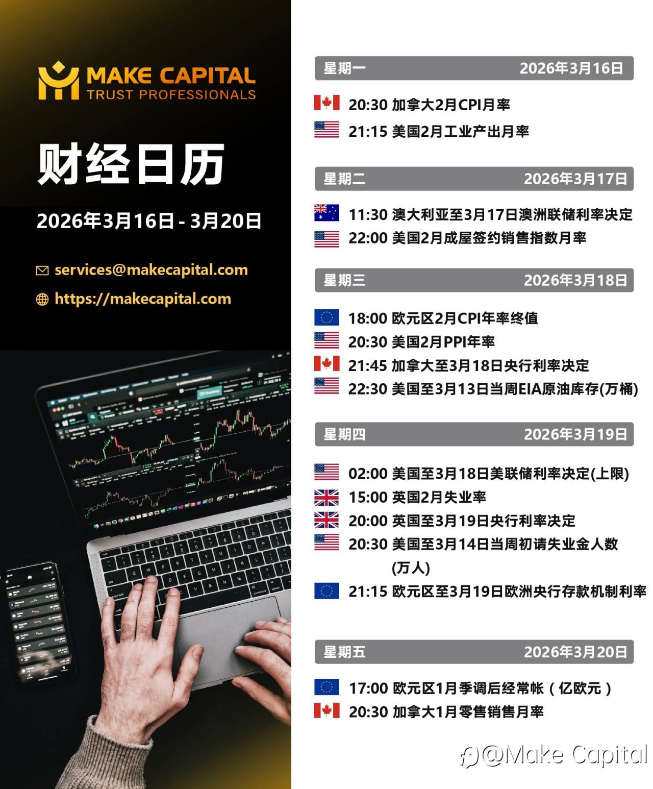 2026年3月16日 - 3月20日财经日历 风险提示:本文所述仅代表作者个人观点,不代表 Followme 的官方立场。Followme 不对内容的准确性、完整性或可靠性作出任何保证,对于基于该内容所采取的任何行为,不承担任何责任,除非另有书面明确说明。