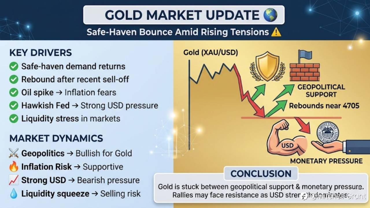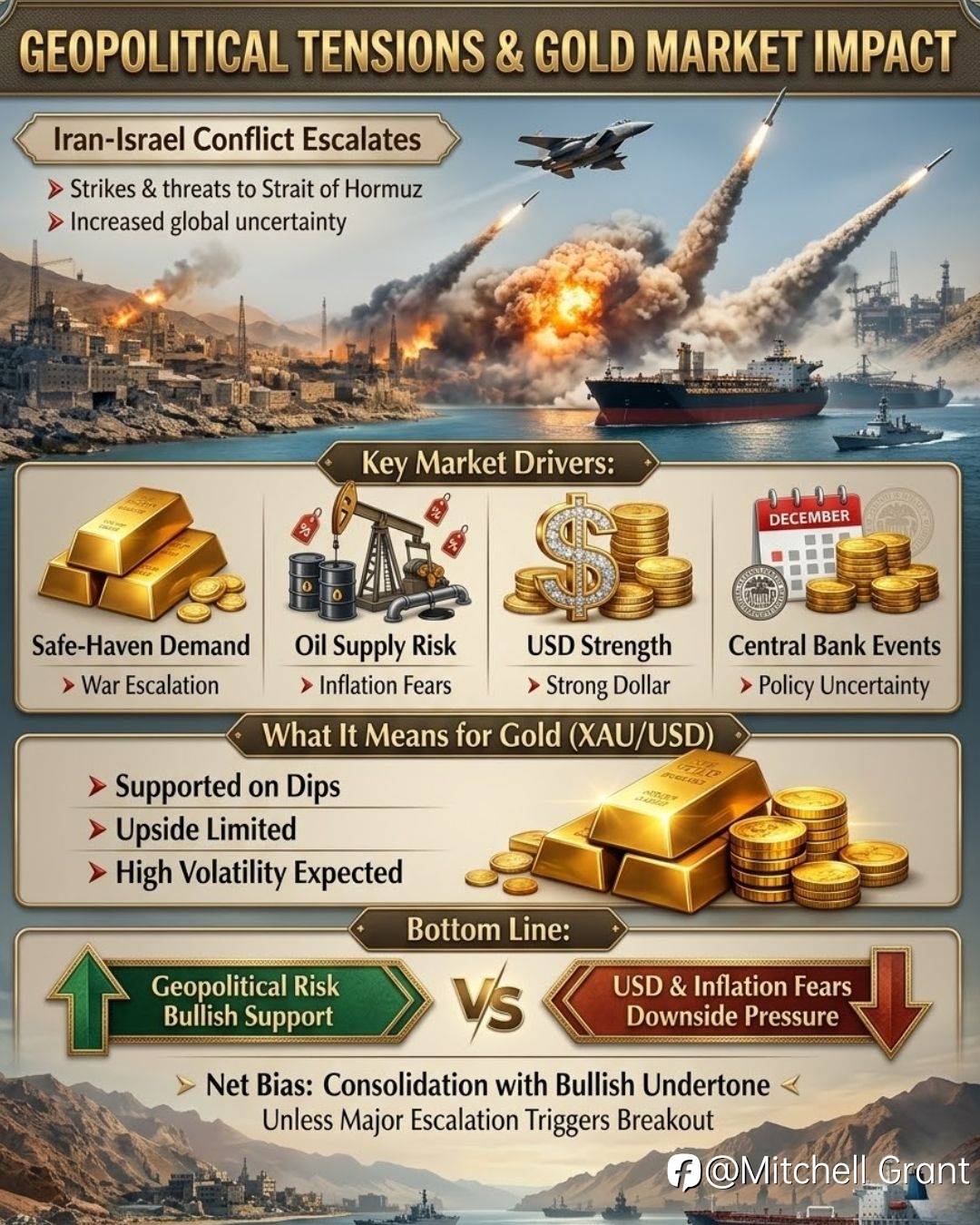 War tensions boost safe-haven demand 🟡 while strong USD & inflation fears limit upside 📉
