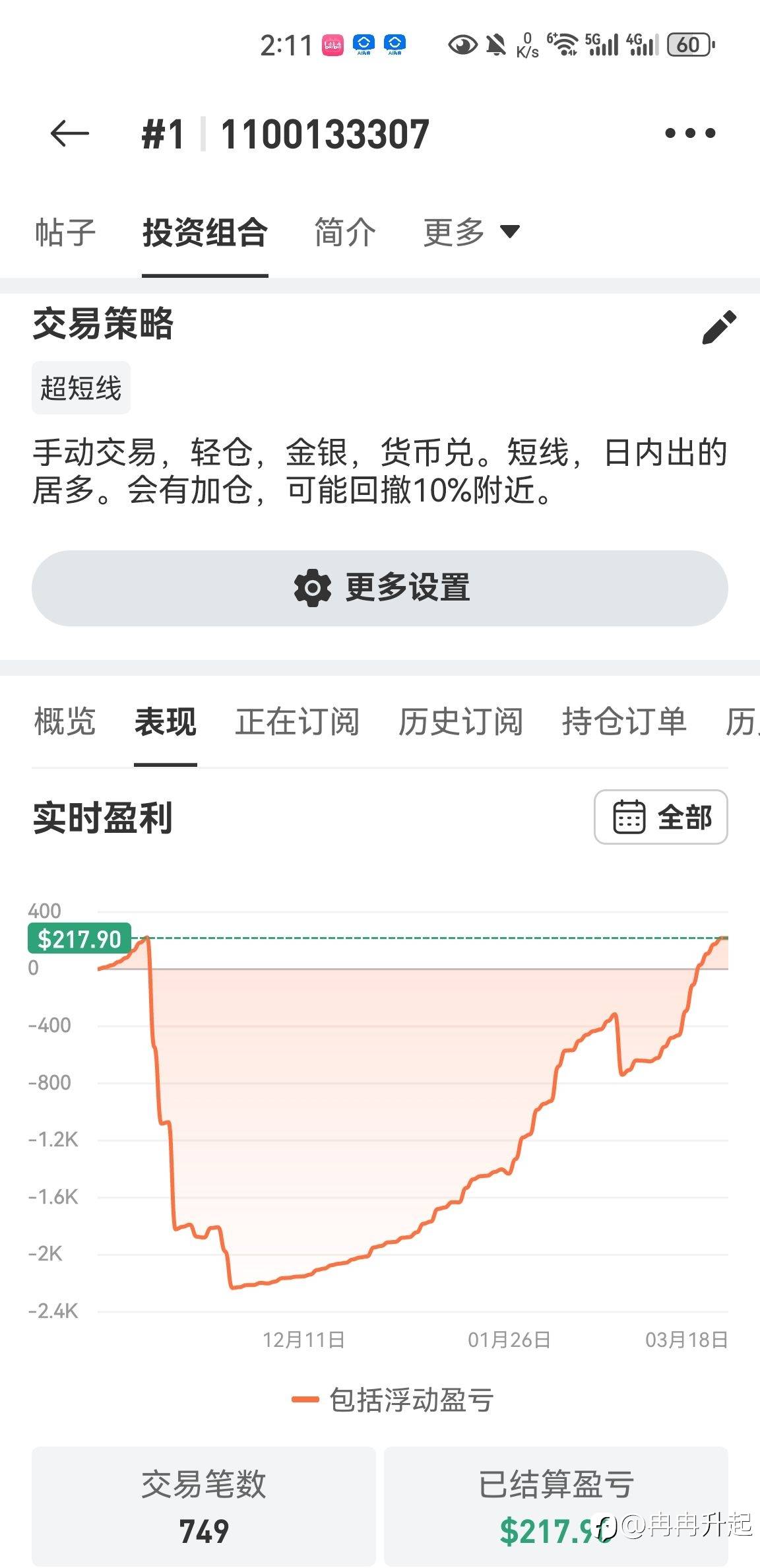 今天估计做单完毕了,这个账号赚140。 风险提示:本文所述仅代表作者个人观点,不代表 Followme 的官方立场。Followme 不对内容的准确性、完整性或可靠性作出任何保证,对于基于该内容所采取的任何行为,不承担任何责任,除非另有书面明确说明。