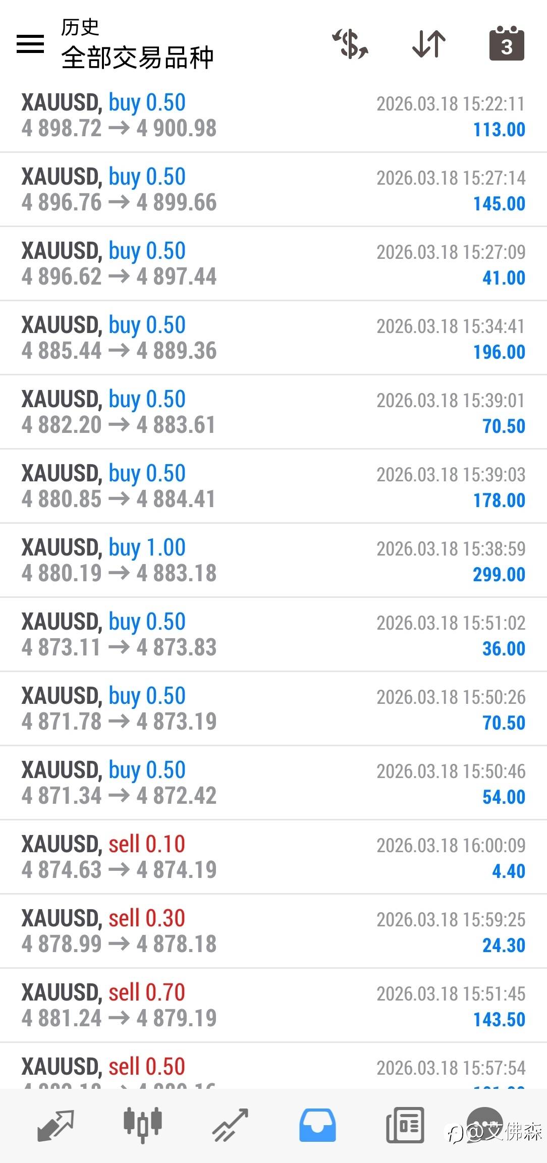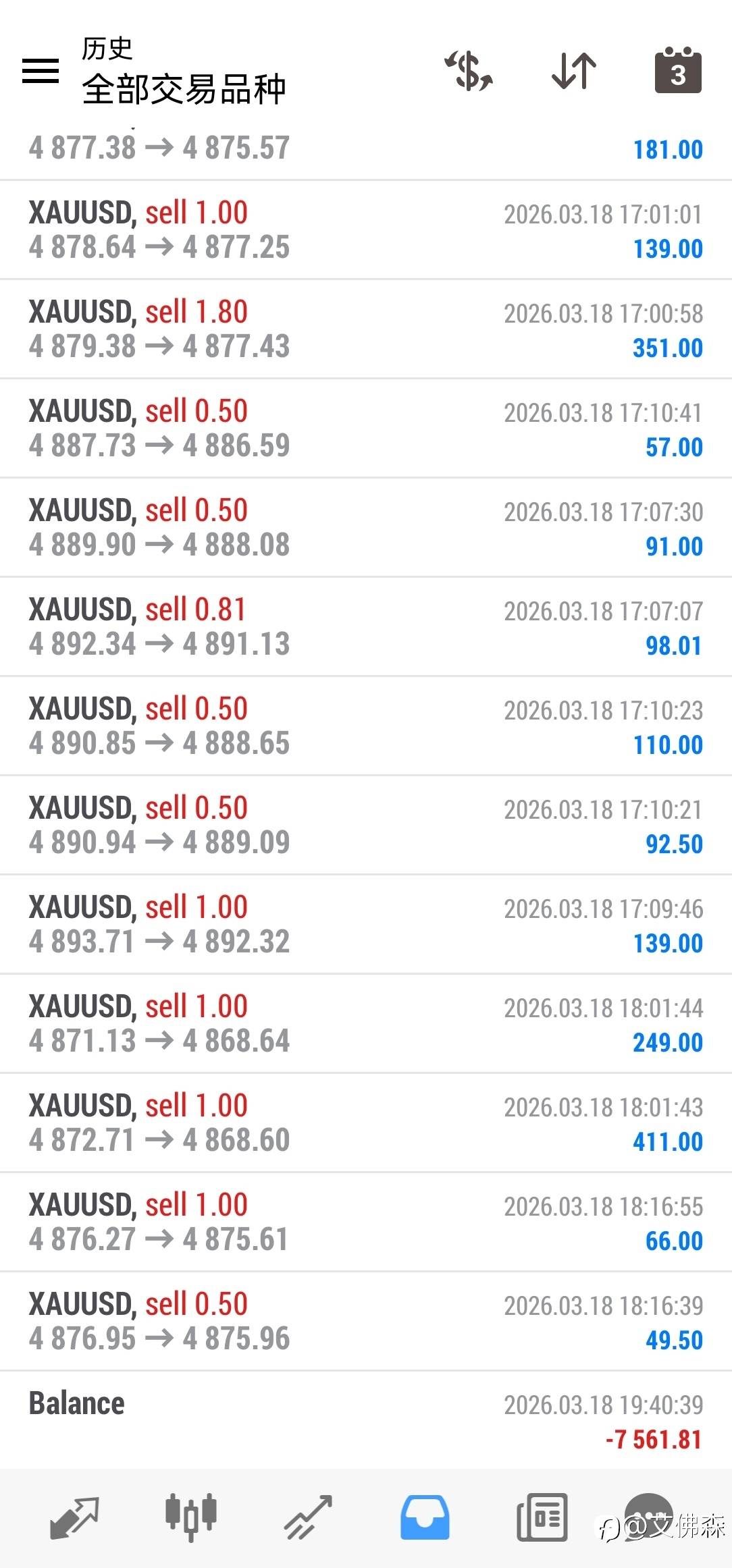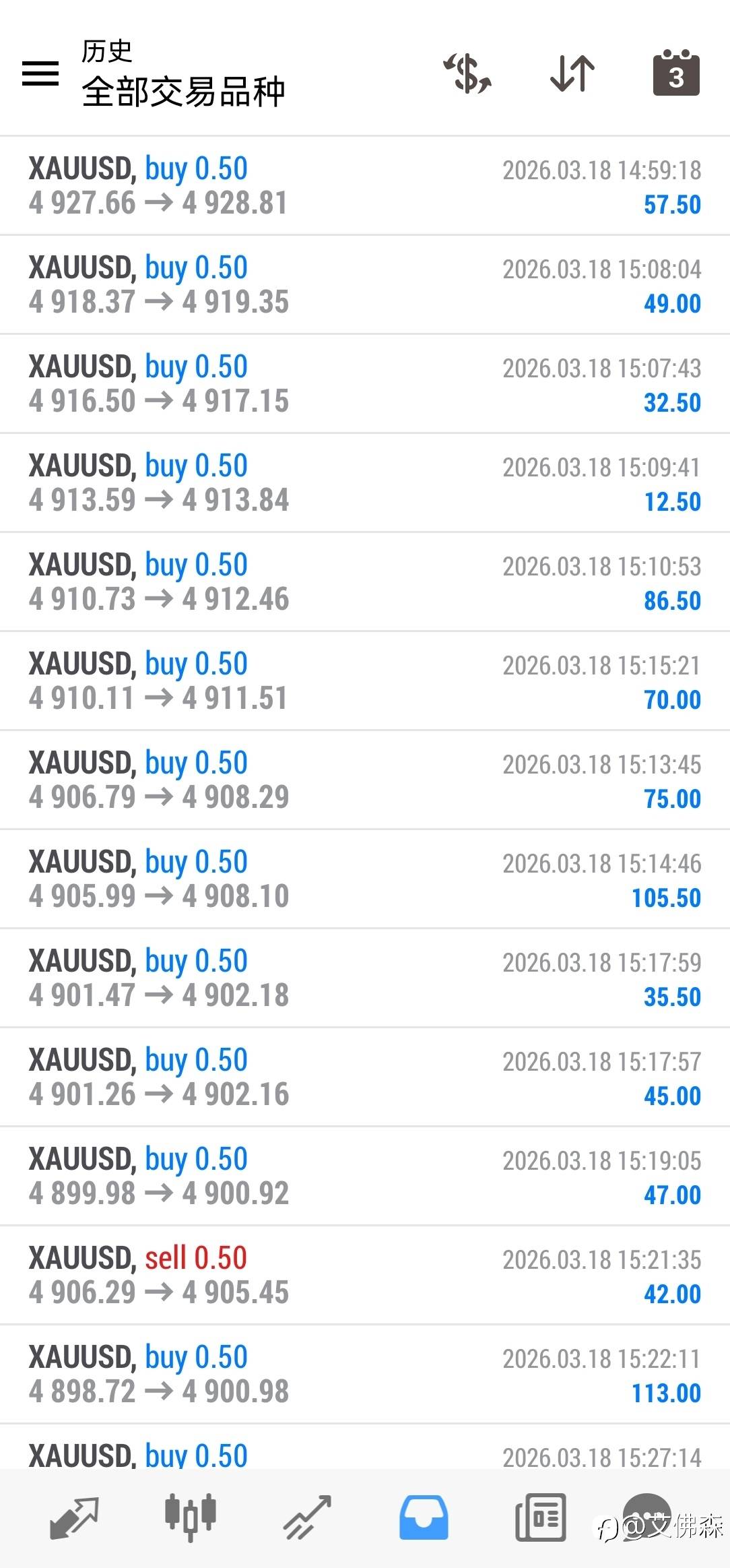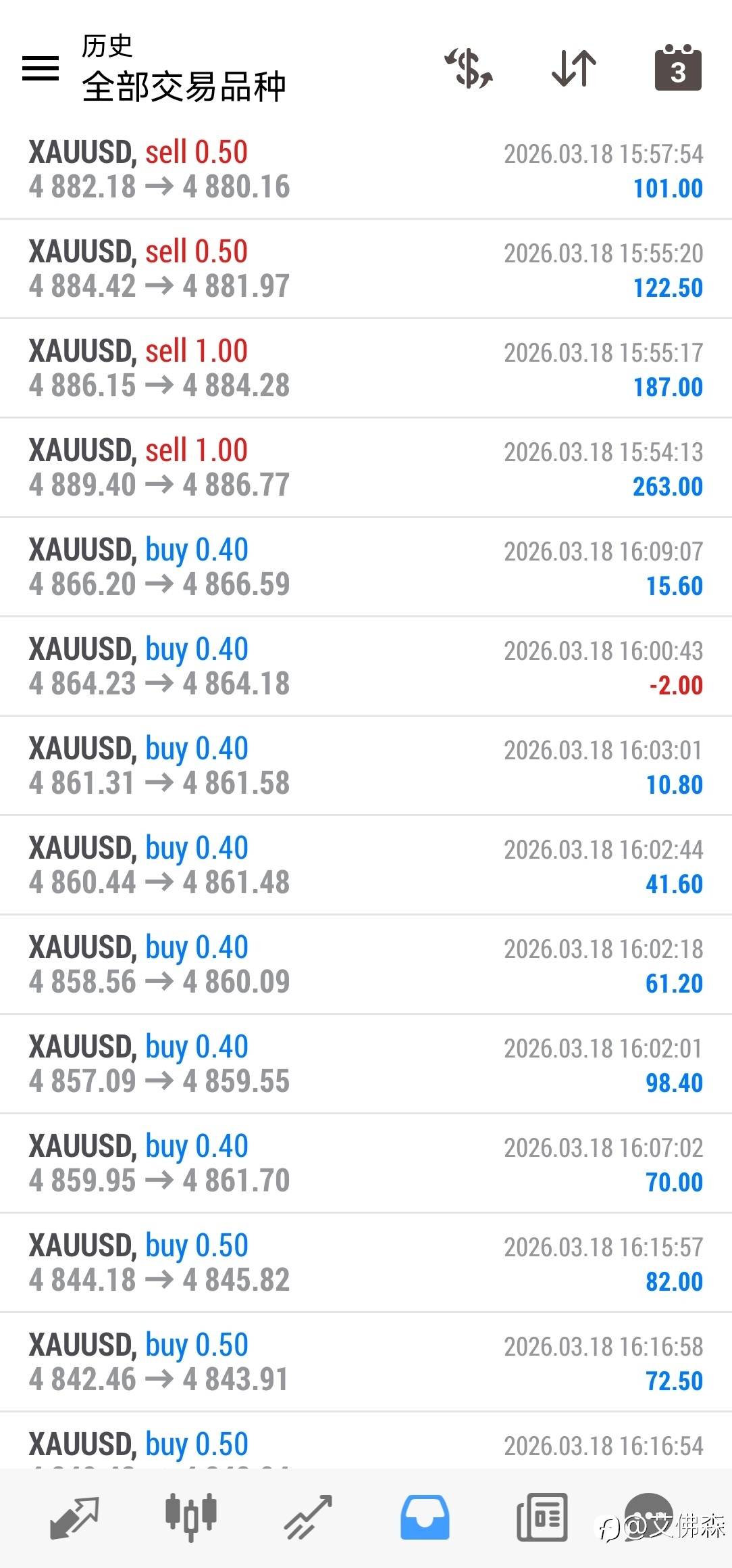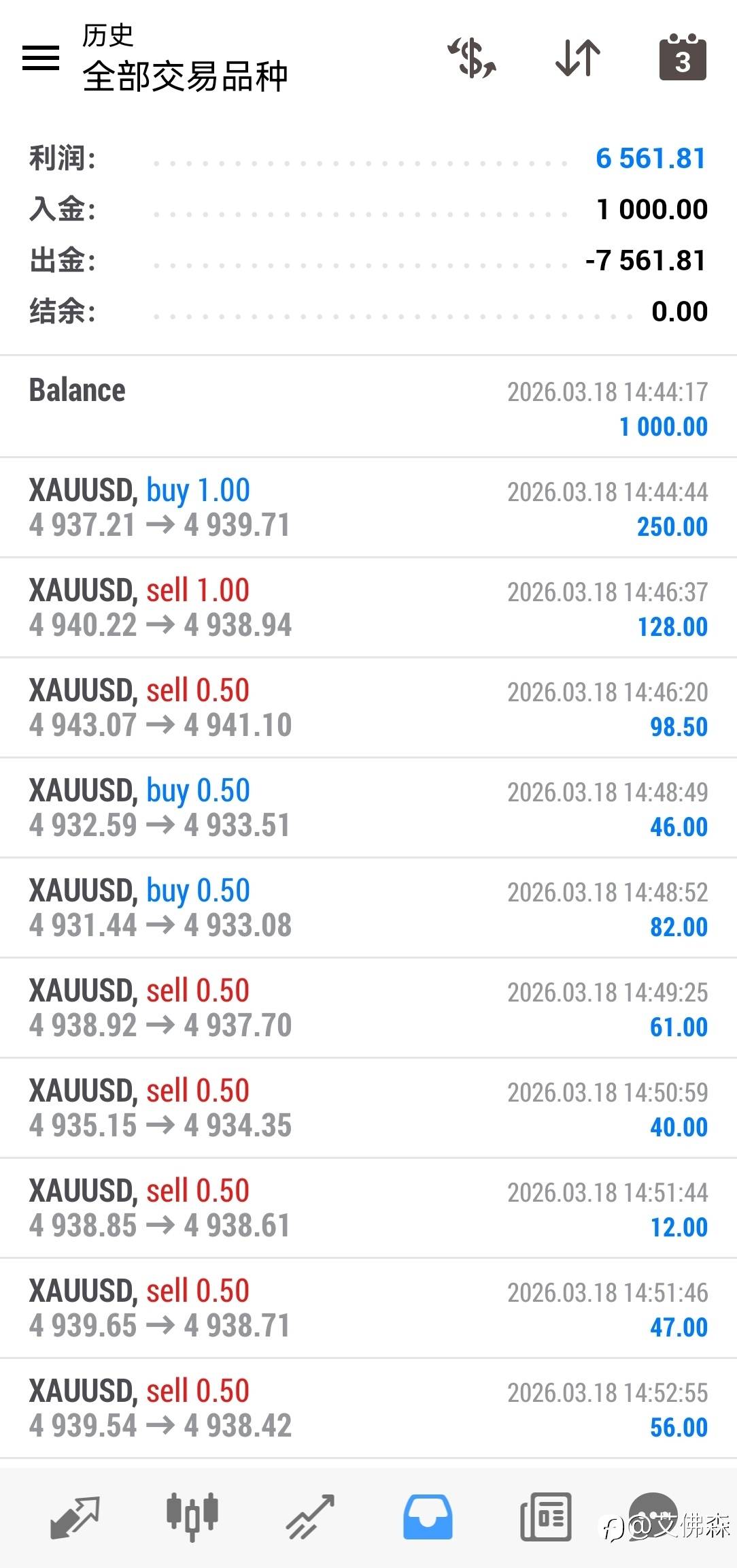 昨晚行情大赚一波,入金1000美金,加上佣金赚了7200美金,交易68笔就亏损一笔2美金的订单,2026真是赚钱的一年! 已编辑 19 Mar 2026, 05:47 风险提示:本文所述仅代表作者个人观点,不代表 Followme 的官方立场。Followme 不对内容的准确性、完整性或可靠性作出任何保证,对于基于该内容所采取的任何行为,不承担任何责任,除非另有书面明确说明。