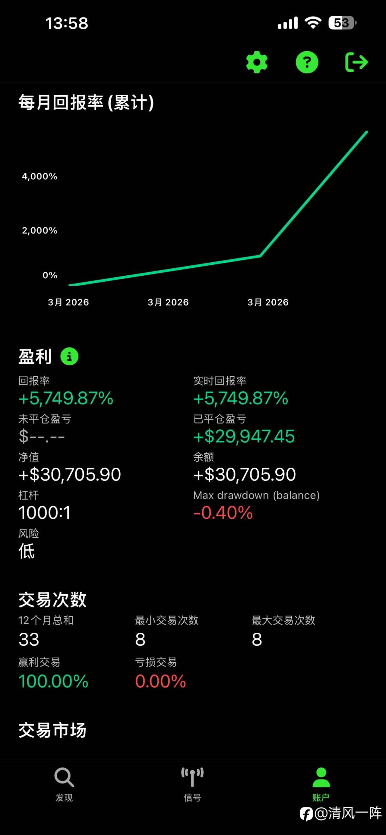 免得黑子又来黑,今天连接一下账户,不到24小时,百分百胜率,40倍做出来了 风险提示:本文所述仅代表作者个人观点,不代表 Followme 的官方立场。Followme 不对内容的准确性、完整性或可靠性作出任何保证,对于基于该内容所采取的任何行为,不承担任何责任,除非另有书面明确说明。