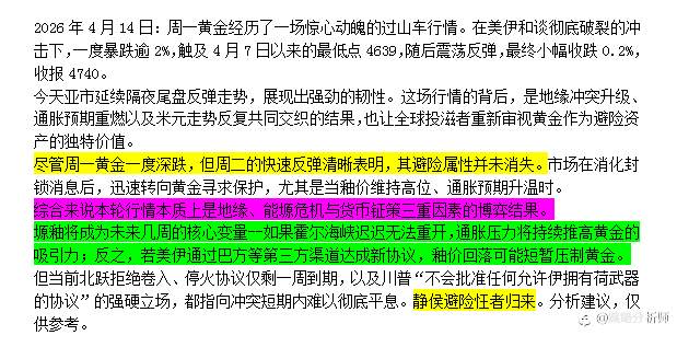 #XAU/USD#尽管周一黄金一度深跌,但周二的快速反弹清晰表明,其避险属性并未消失#XAG/USD##WTI.F# 风险提示:本文所述仅代表作者个人观点,不代表 Followme 的官方立场。Followme 不对内容的准确性、完整性或可靠性作出任何保证,对于基于该内容所采取的任何行为,不承担任何责任,除非另有书面明确说明。