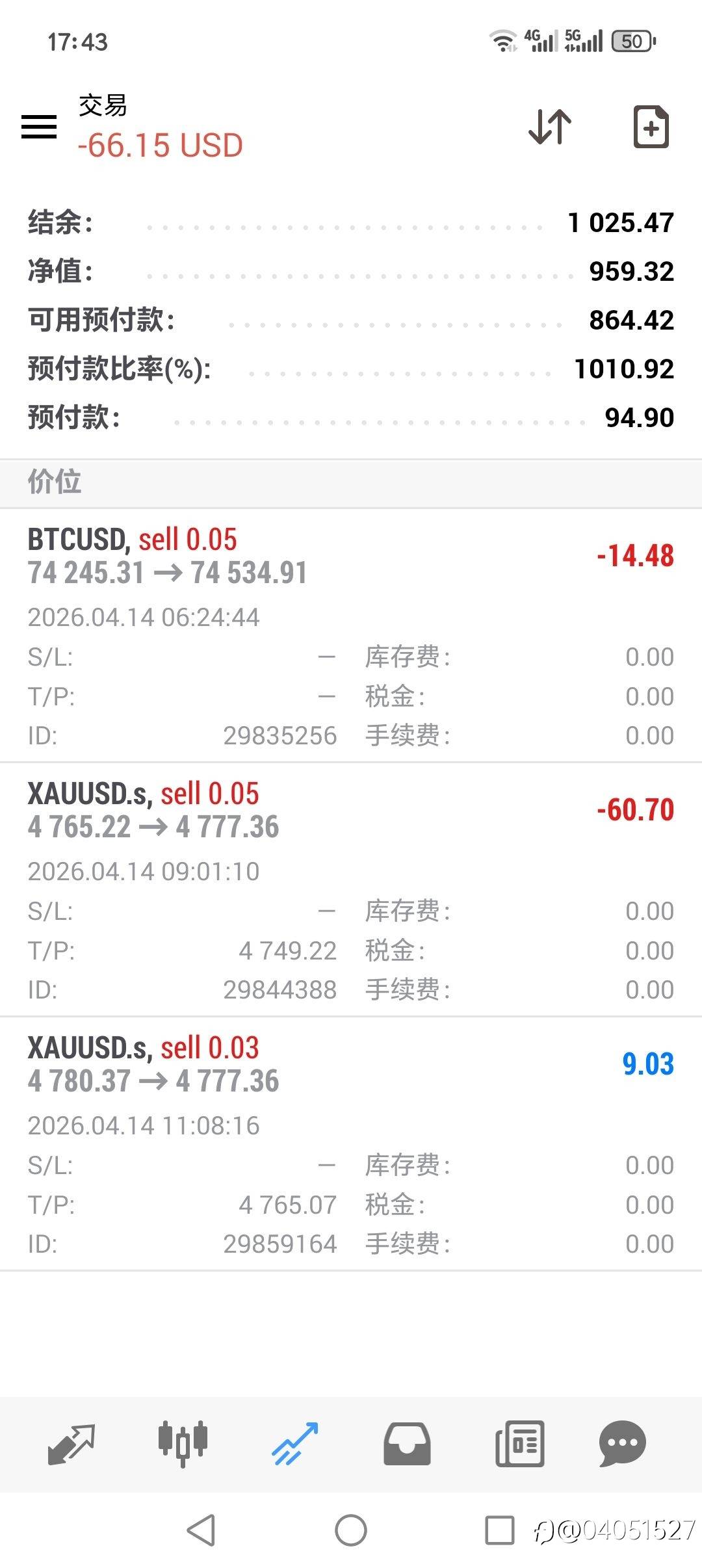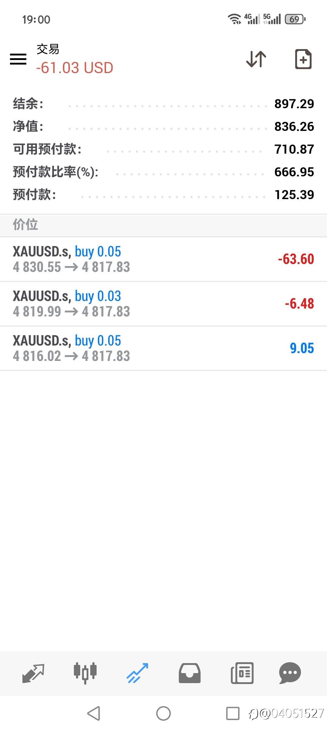 这个星期的单子做的都不好,一是资金多了,二是开始重仓+加仓,三是盈利不出局,继续扛单到止盈位,四是止损了,利润变少了,记录四月大亏损,先收手,冷静一下再做 风险提示:本文所述仅代表作者个人观点,不代表 Followme 的官方立场。Followme 不对内容的准确性、完整性或可靠性作出任何保证,对于基于该内容所采取的任何行为,不承担任何责任,除非另有书面明确说明。