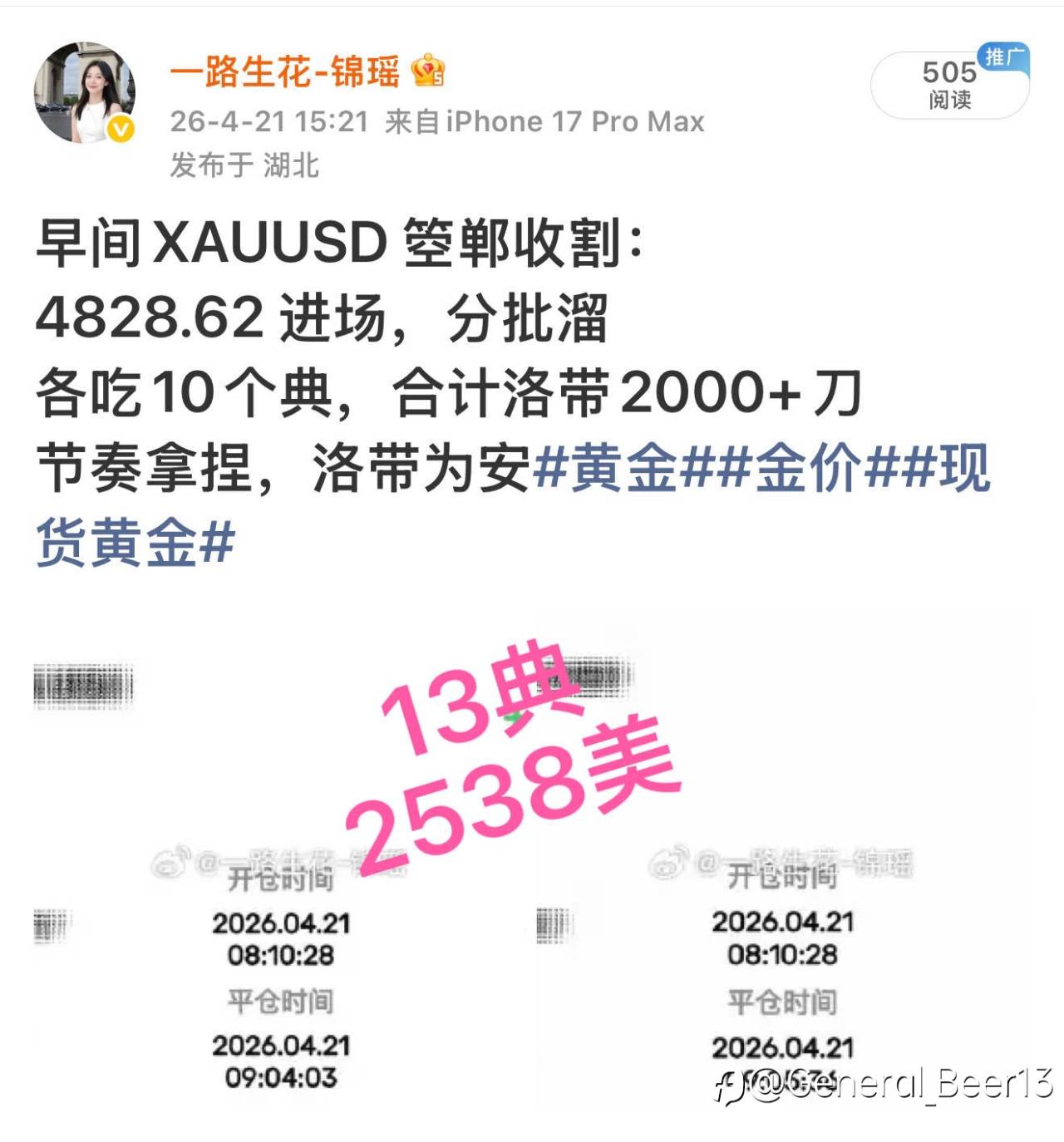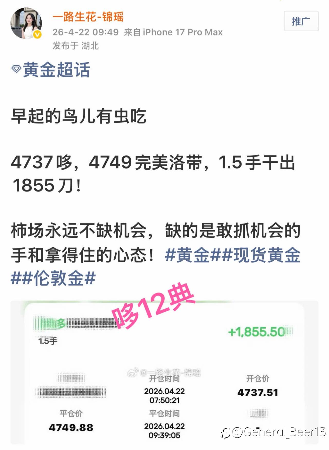 周末复磐 4.20周一交易回顾 周一全天双向波段通吃,全程稳稳踏准节奏,单日累计拿下超120典区间,最终落带37000+美🔪 航情永远起伏不定,稳住节奏与心态,每一份踏实的步菊,终会收获满意的答卷。 #XAU/USD# #每日交易打卡# #创作者# 风险提示:本文所述仅代表作者个人观点,不代表 Followme 的官方立场。Followme 不对内容的准确性、完整性或可靠性作出任何保证,对于基于该内容所采取的任何行为,不承担任何责任,除非另有书面明确说明。