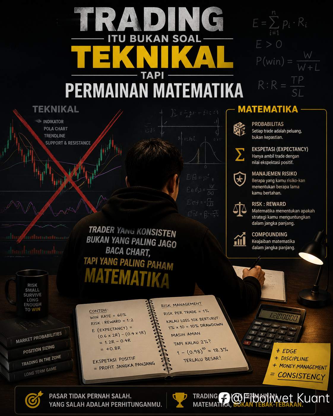 Teknikal itu hanya 10% saja sisanya adalah permainan angka dan strategi mengatur lot, dan tidak berusaha memprediksi arah, karena semuanya adalah soal hitungan dan statistik saja