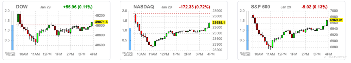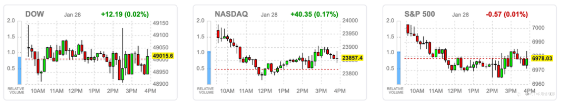 大盘回顾 鹰派定调压制情绪,地缘冲突扰动放大波动 美联储维持利率不变,但会议基调与鲍威尔讲话明显偏鹰,通胀重新成为政策核心关切。声明中对经济活动的表述由“温和”上调为“稳健”,同时弱化了就业下行风险的措辞,市场对短期降息的预期进一步降温。利率决议后,3月降息概率降至个位数,美元阶段性企稳,风险资产整体情绪受压,指数层面呈现高位震荡。 地缘政治风险显著升温。特朗普公开威胁对伊朗采取更强硬行动,引发避险资产盘中剧烈波动。黄金、白银在续创新高后快速跳水,金价一度逼近5600美元、银价接近120美元后回落,反映在“地缘+货币”双重博弈下,资金交易节奏明显加快,短线获利了结情绪集中释放。 股市内部结构分