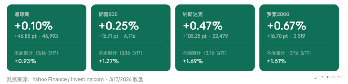 大盘回顾 美股强势反弹叠加地缘扰动,AI与大宗商品共振走强 3月16日,美股三大指数集体反弹,道琼斯指数上涨0.83%,标普500指数上涨1.01%,纳斯达克指数上涨1.22%,结束此前连续调整走势。市场情绪受到国际油价回落提振,布伦特原油报101.44美元/桶、WTI报93.89美元/桶。同时,比特币强势突破7.5万美元,带动加密概念股集体走强,风险资产出现阶段性修复。 科技板块继续领涨,英伟达上涨1.65%,CEO 黄仁勋提出2027年营收或达1万亿美元的激进目标,并推出NemoClaw等AI生态产品,强化市场对“算力经济”的长期预期。同时,Meta Platforms、苹果公司等科技巨头