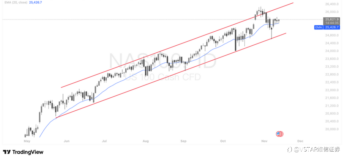 大盘回顾 降息预期回升叠加AI扩张,美股重返50日线附近 市场重新聚焦于12月潜在降息预期和AI生态系扩张,这两股力量叠加推动美股三大指数反弹,主要指数收盘回到50日均线附近,并重新站上关键短期趋势支撑。盘中因Alphabet推出新AI模型一度引发大型科技股(NVDA、MSFT、AMD、ORCL)波动下挫,但很快被市场解读为AI行业规模扩张和生态重估的一部分,而非纯利空,随后科技股回稳并带动指数重启涨势,收盘接近当日高点。 最新公布的美国经济数据偏向保守,暗示年底消费前景趋谨慎:9月零售销售月增0.2%(前值0.6%)低于预期0.4%,消费者信心降至88.7(预期93.3),核心PPI同比降至