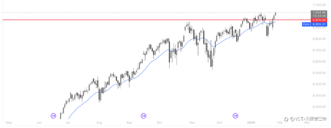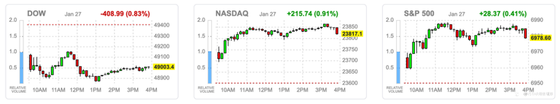 大盘回顾 风险溢价上行下的“结构性强势” 周一美股在多重不确定性交织下呈现出“指数走稳、结构分化”的典型格局。宏观层面,Donald Trump再度升级贸易摩擦,宣布将对韩国商品的对等关税从15%上调至25%,直接抬升全球贸易与地缘政治风险溢价。避险情绪迅速传导至大宗商品市场,黄金、白银盘中创下历史新高后出现获利回吐,显示资金在“避险—兑现—再配置”之间快速切换。 政策预期方面,美联储维持利率不变的概率高达96%,短期货币政策不再构成主要扰动,但“高利率维持更久”的背景,使市场对增长与估值的容忍度持续下降。与此同时,欧洲议会推迟是否恢复批准欧美贸易协议的决定,也令跨大西洋经贸关系的不确定性延续